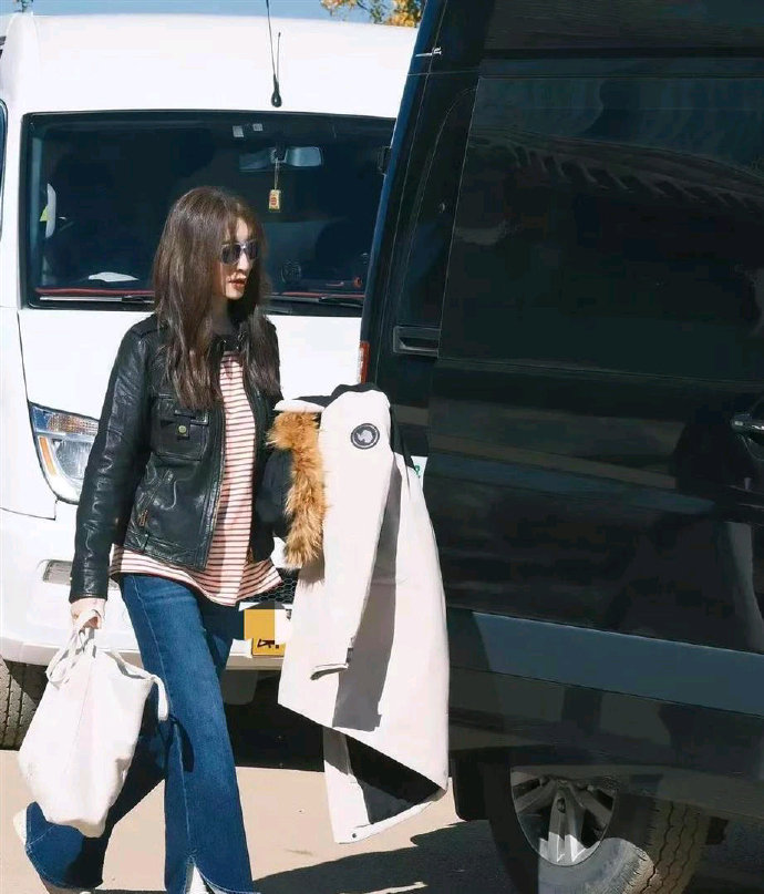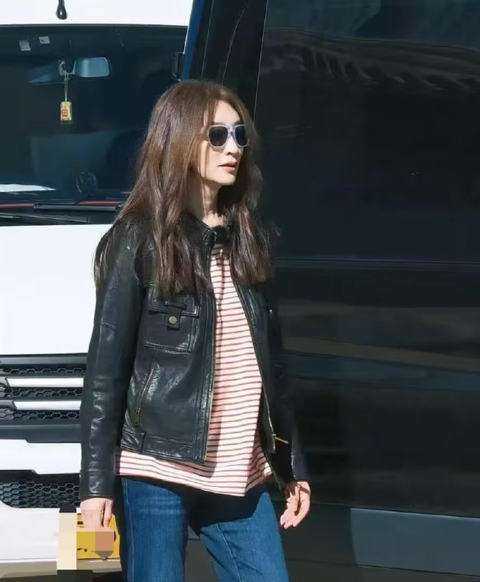 李小冉的中年穿搭真时髦!黑色皮衣+条纹长袖+牛仔裤,休闲又减龄