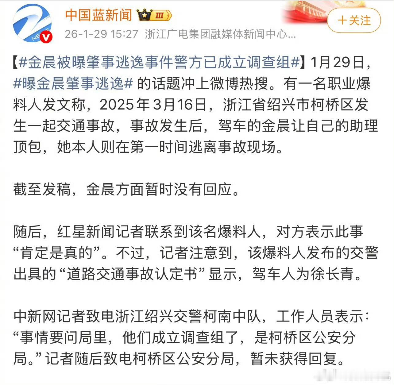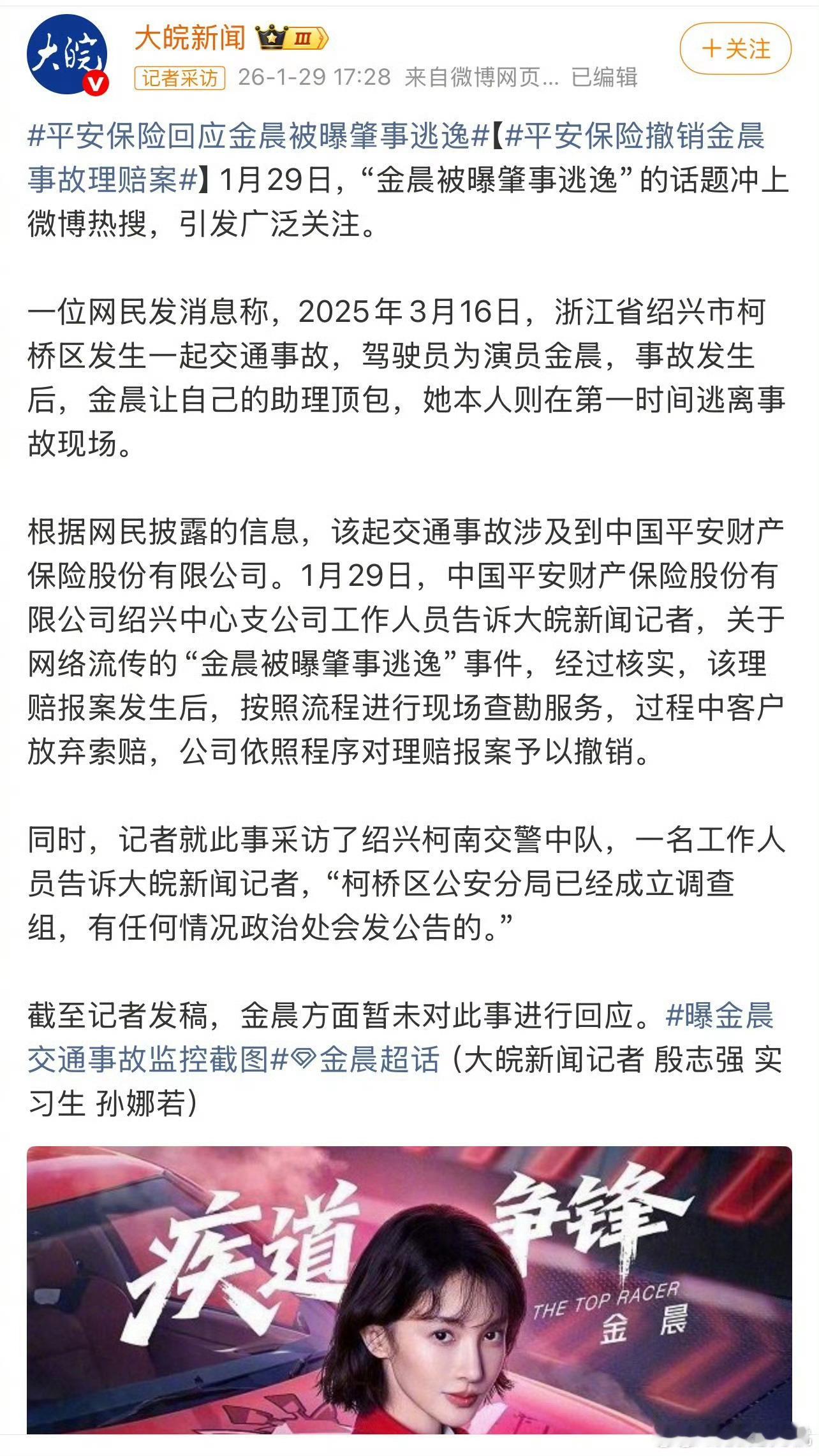 金晨这个事目前交警和保险公司的回应曝金晨肇事逃逸