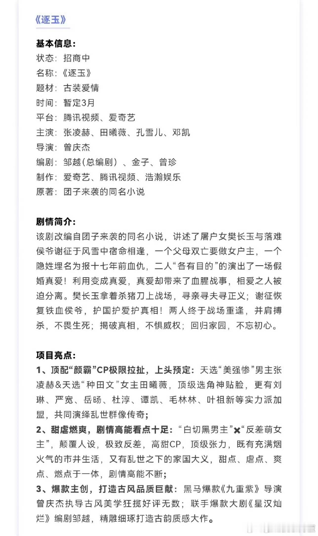 张凌赫 田曦薇《逐玉》招商开始了,快点播出吧已经等不及了