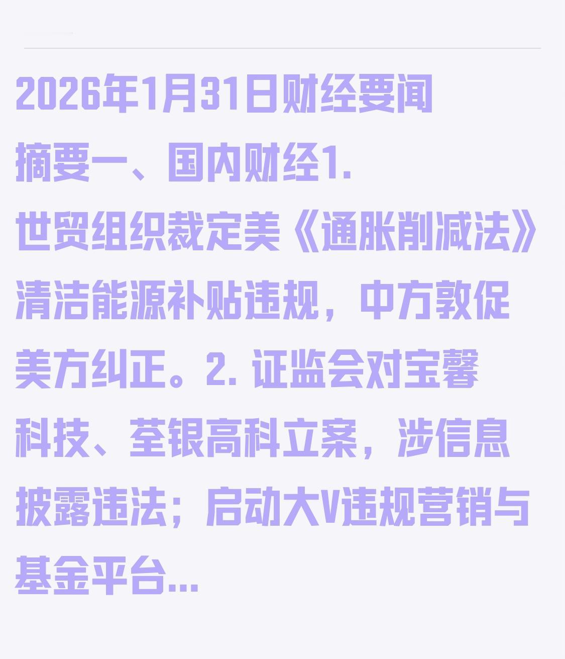2026年1月31日财经要闻摘要 一、国内财经 1. 世贸组织裁定美《通胀削减法》清洁能源补贴违规,中方敦促美方纠正。 2. 证监会对宝馨科技、荃银高科立案,涉信息披露违法;启动大V违规营销与基金平台专项治理,下架“实时估值”等功能。 3. 发改委能源局:新能源高占比地区加快容量补偿,煤电容量电价回收固定成本≥50%。 4. 2025年江苏首超广东成第一消费大省;规上文化企业营收15.21万亿元,同比+7.4%。 5. 1月30日A股:沪指-0.96%,深成指-0.66%,创业板指+1.48%;成交约2.84万亿元,缩量3945亿。 二、国际财经 1. 美股收跌但1月普涨;中概股普跌,台积电-2.65%、阿里-2.69%。 2. 贵金属重挫:现货黄金-12%至4705美元/盎司,白银-34%至76美元/盎司,拖累大宗商品货币。 3. 德国1月通胀降至2%;法国央行称欧元区通胀夏季有望达2%目标,支撑ECB降息预期。 4. 美国政府停摆风险约30%;特斯拉拟二季度末停产Model S,转向机器人业务。 三、上市公司重要公告 1. 万华化学:拟190.86亿元增资烟台烯烃,整合碳二产业降负债。 2. 三六零:用不超5亿元闲置募资做保本理财(协定存款/大额存单等)。 3. 奥浦迈:拟3亿元超募资金永久补流,占超募总额29.75%,待股东大会审议。 4. 西部黄金:2025年净利同比+46.78%至+69.23%。 5. 宁德时代:钠电品牌“钠新”将在乘用车领域公开冬测。 四、其他重要提示 1. 建行2月2日起个人黄金积存定期起点金额上调至1500元。 2. 上海第三轮家电以旧换新补贴31日0点起报名,至2月2日20点。 风险提示:本文仅为公开信息整理,不构成任何投资建议;所涉个股/板块为公告提及,非推荐;市场有风险,投资需谨慎。
