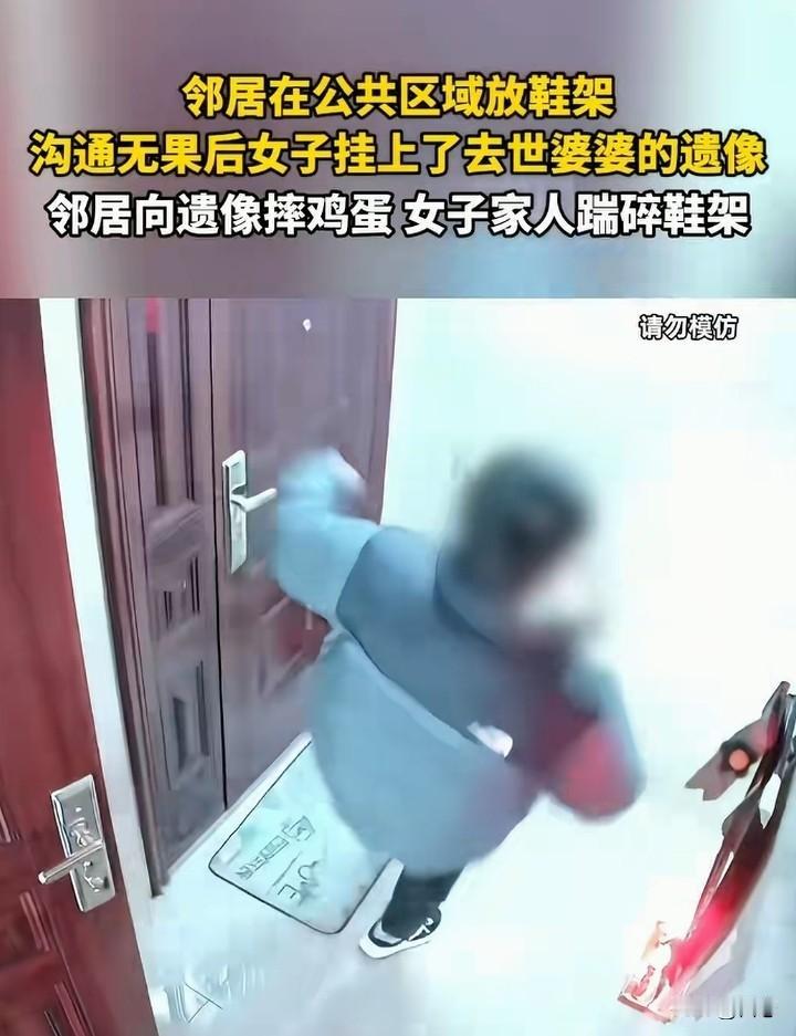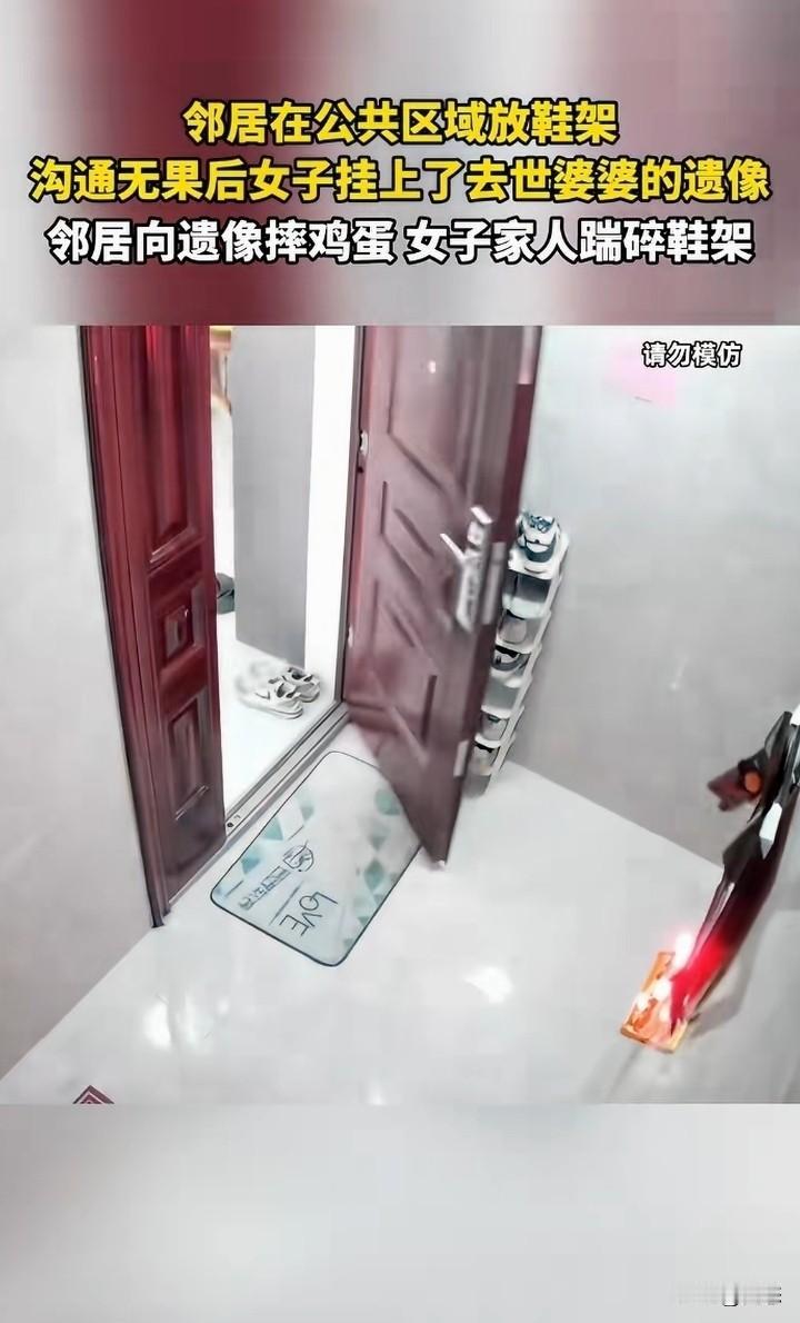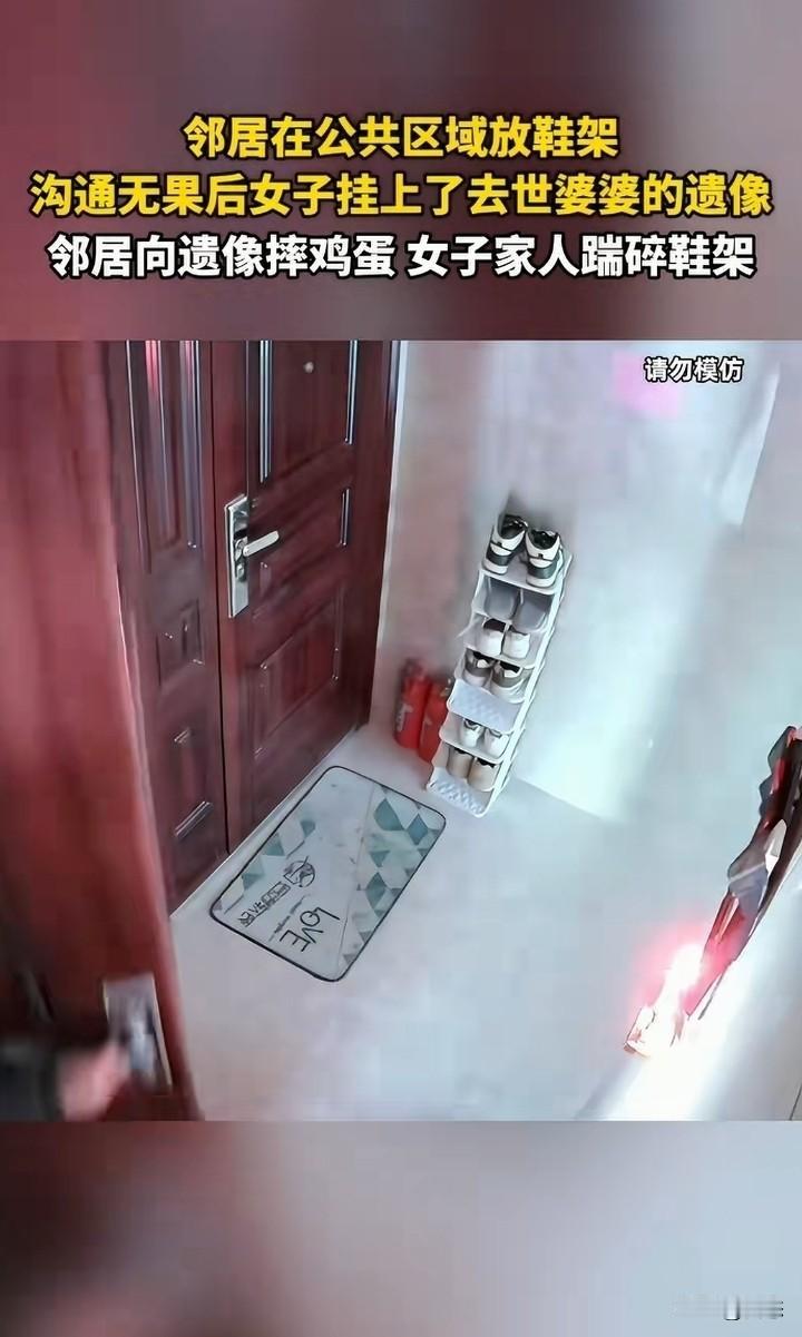 湖南一邻居在公共区域放鞋架,女子和邻居沟通无果后,女子做出让人不可理解的举动,女子居然把去世 的婆婆遗照挂出来。这下邻居看到女子举动非常生气,就向遗照扔鸡蛋。女子就踢邻居家的鞋架。 看到这,一些小事闹得不可开交,实在是不好,沟通沟通不就可以了,公共区域应该保存整洁,至少不要影响邻居吧? 说实话放鞋架有人支持肯定有人就会反对,希望协商好,不能为了自己的私利,不顾别人的感受。 对此你们怎么看呢?如何解决好?