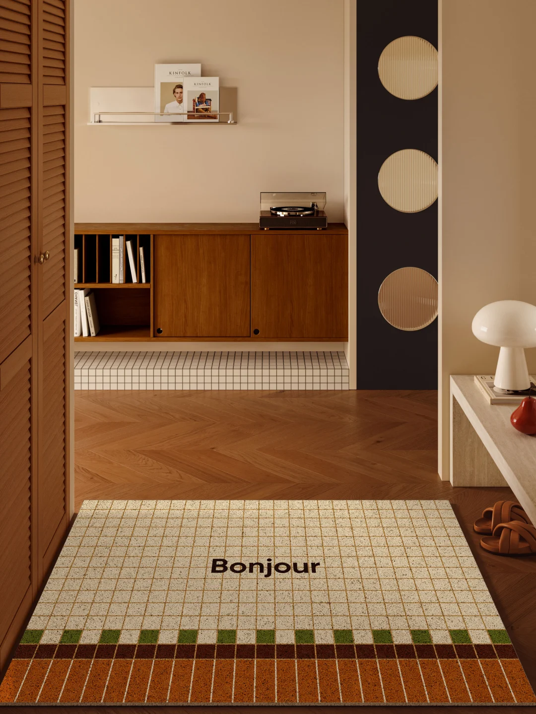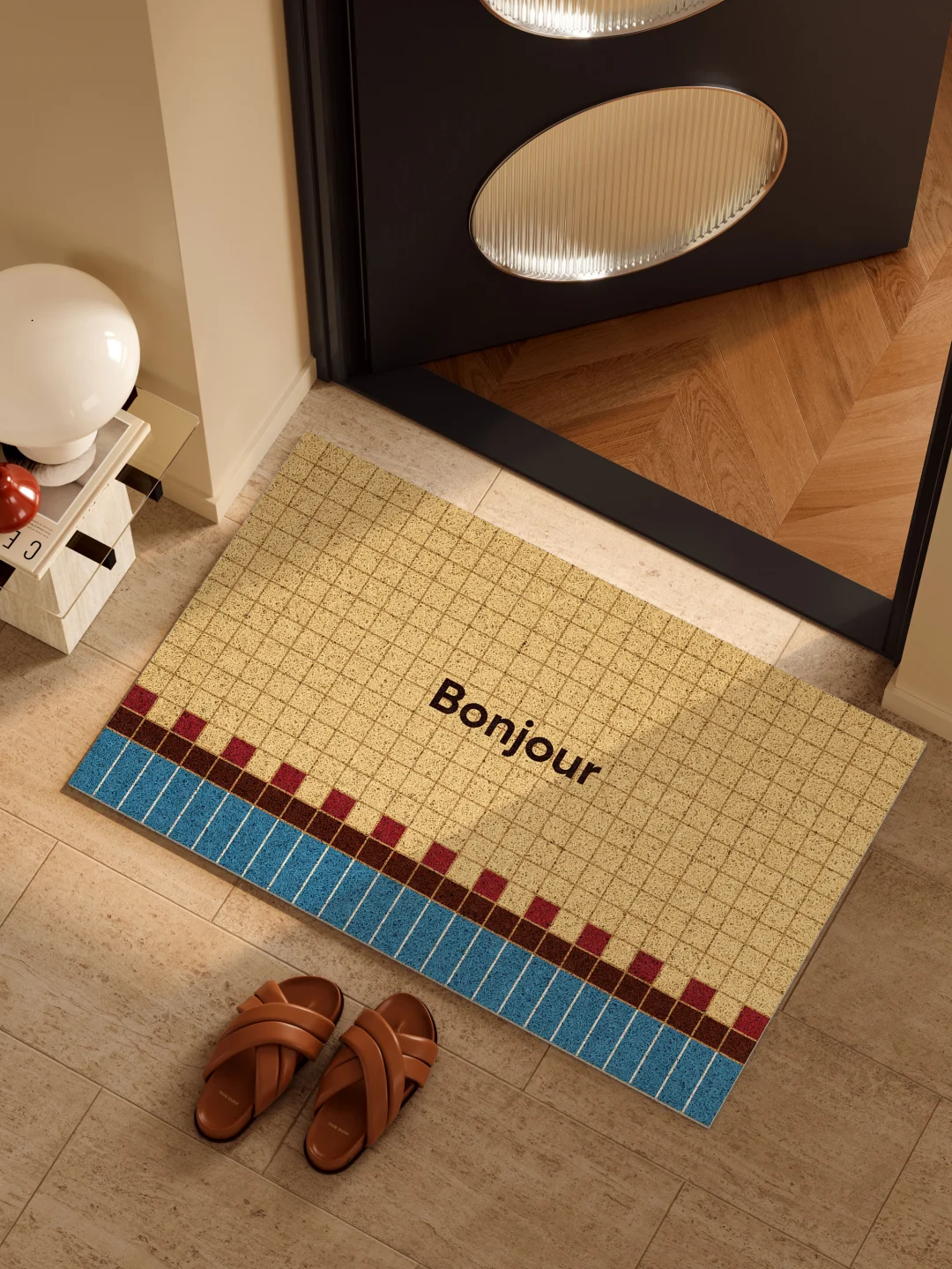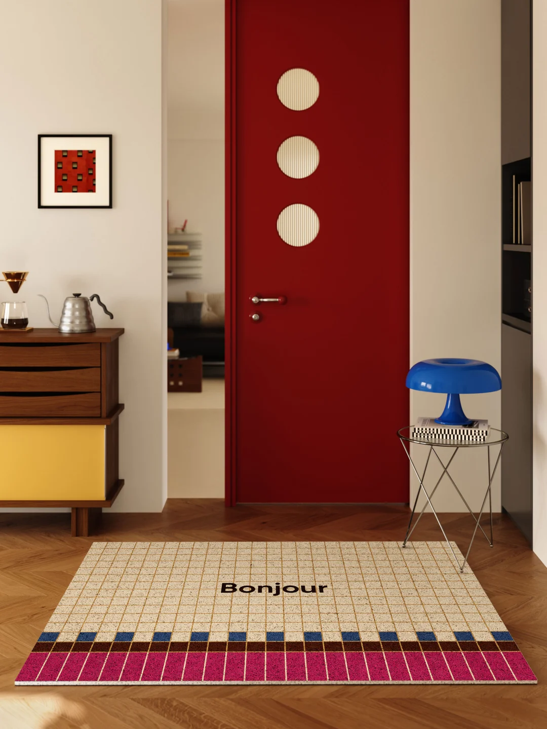 红蓝拼色与细线格纹的搭配 让简单的玄关区多了些艺术感 暖调奶油黄基底 视觉柔和 不显突兀 在家居环境中耐看且易于融入 脚感厚实的丝圈材质 耐磨防刮 适合放在门口使用 也能自然划分出入户区域 小玄关铺上它 整洁之余 空间也更显开阔 -