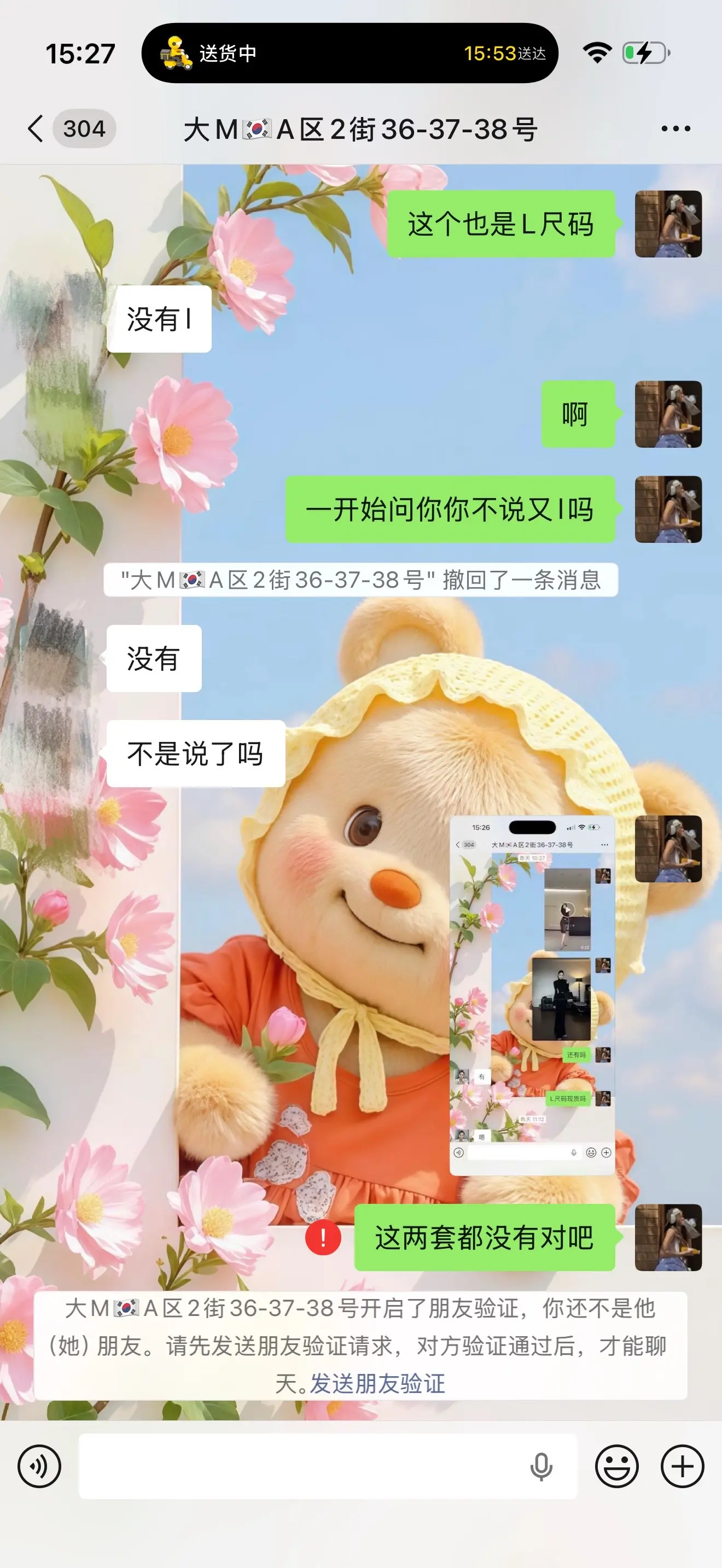 现在卖衣服的实体店都这么牛逼吗?想着买两套衣服送给客户一开始问她她说有L尺码,昨天我又问了一次说确定走这个尺码今天下单要买和我说告诉我和我说过没有这个尺码?于是把我删除了…什么时候卖衣服对待消费者这样,作为消费者是不是的低头买个衣服!真的避雷所有这么操作的服装店
