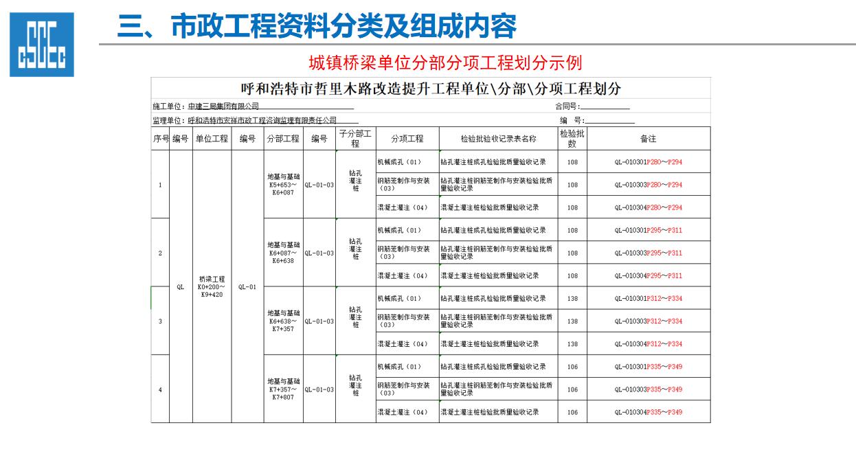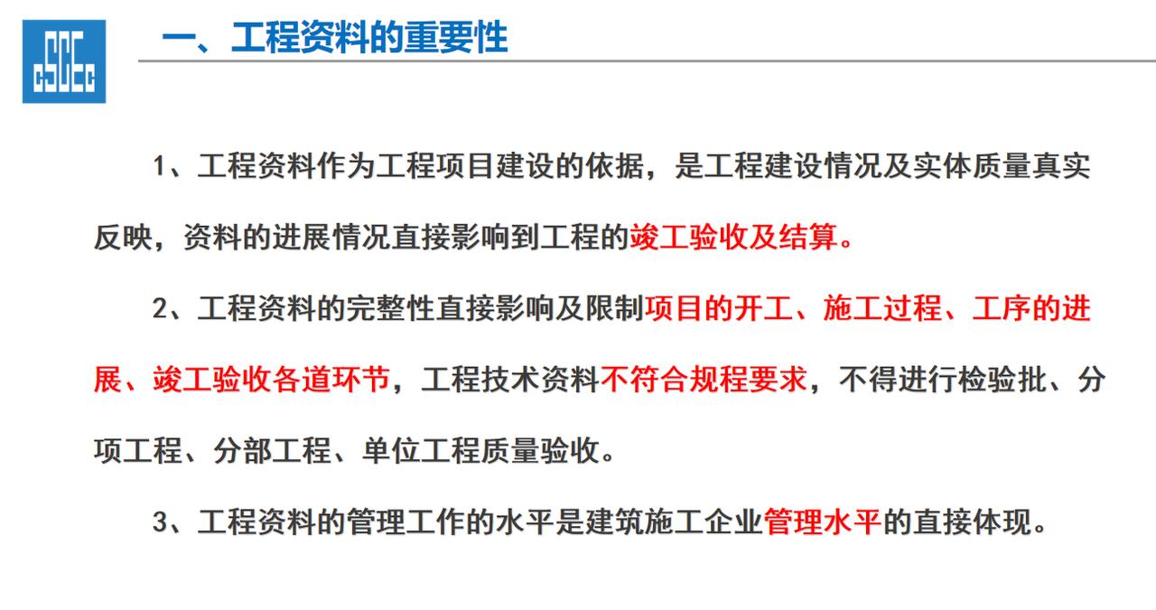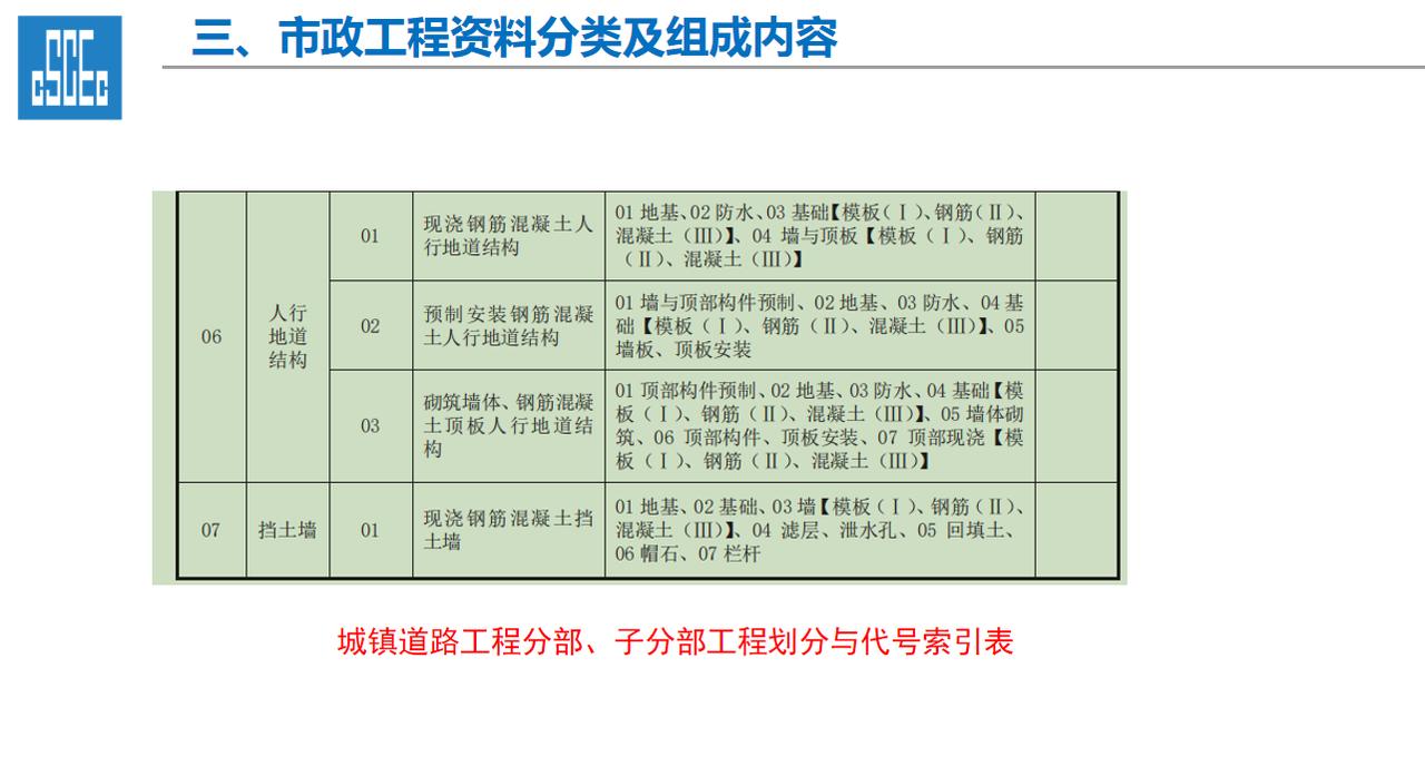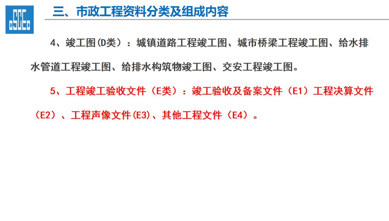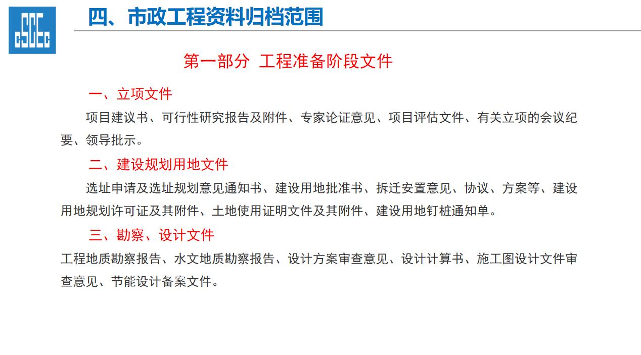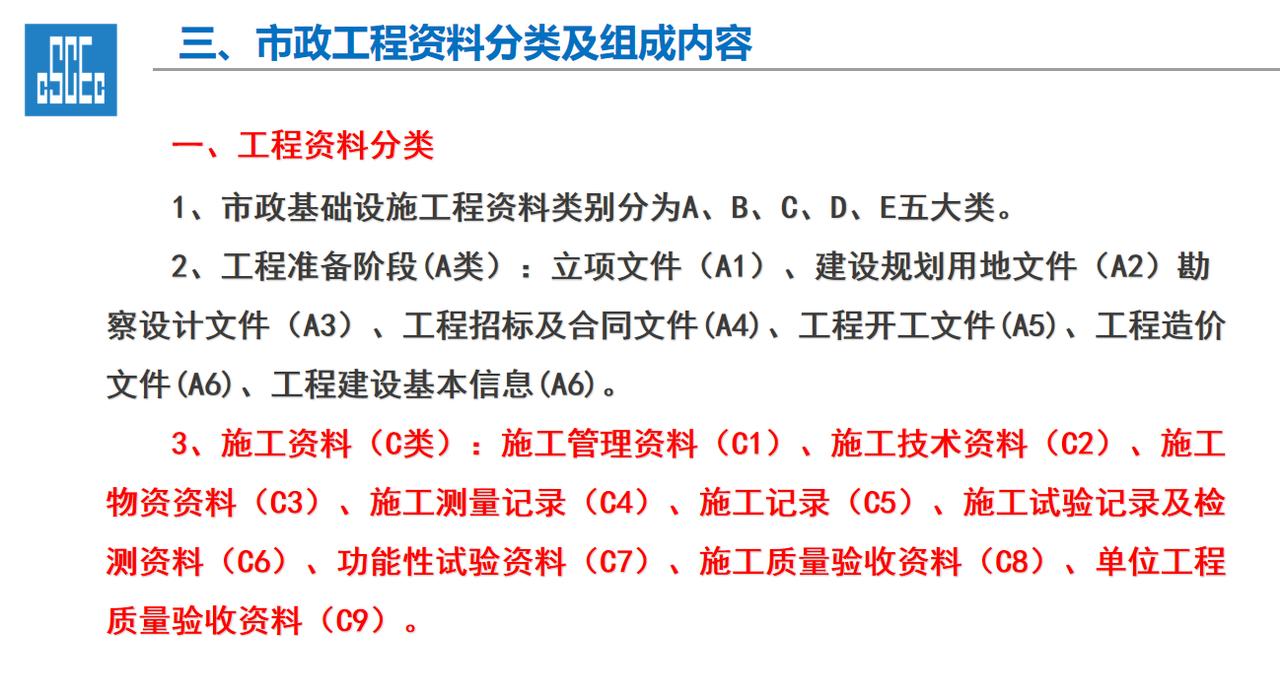 一、工程资料的重要性 1、工程资料作为工程项目建设的依据,是工程建设情况及实体质量真实反映,资料的进展情况直接影响到工程的竣工验收及结算。 2、工程资料的完整性直接影响及限制项目的开工、施工过程、工序的进展、竣工验收各道环节,工程技术资料不符合规程要求,不得进行检验批、分项工程、分部工程、单位工程质量验收。 3、工程资料的管理工作的水平是建筑施工企业管理水平的直接体现。 二、市政工程资料分类及组成内容 一、工程资料分类 1、市政基础设施工程资料类别分为A、B、C、D、E五大类。 2、工程准备阶段(A类):立项文件(A1)、建设规划用地文件(A2)勘察设计文件(A3)、工程招标及合同文件(A4)、工程开工文件(A5)、工程造价文件(A6)、工程建设基本信息(A6)。 3、施工资料(C类):施工管理资料(C1)、施工技术资料(C2)、施工物资资料(C3)、施工测量记录(C4)、施工记录(C5)、施工试验记录及检测资料(C6)、功能性试验资料(C7)、施工质量验收资料(C8)、单位工程质量验收资料(C9)。 4、竣工图(D类):城镇道路工程竣工图、城市桥梁工程竣工图、给水排水管道工程竣工图、给排水构筑物竣工图、交安工程竣工图。 5、工程竣工验收文件(E类):竣工验收及备案文件(E1)工程决算文件(E2)、工程声像文件(E3)、其他工程文件(E4)。