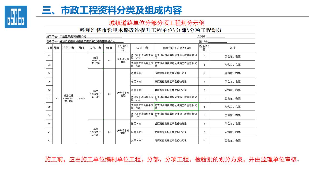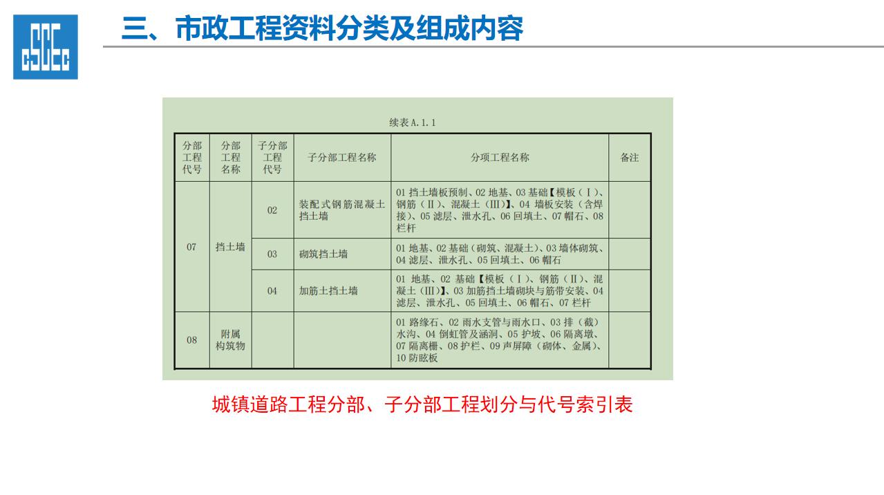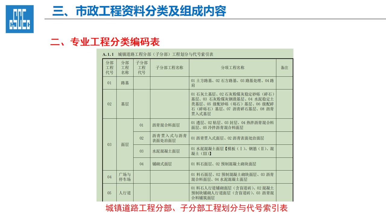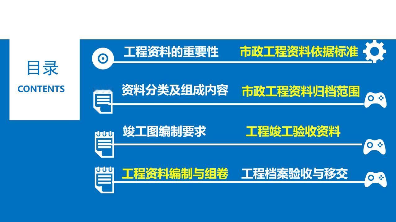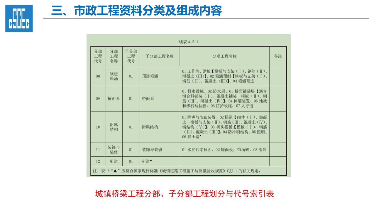 一、工程资料的重要性 1、工程资料作为工程项目建设的依据,是工程建设情况及实体质量真实反映,资料的进展情况直接影响到工程的竣工验收及结算。 2、工程资料的完整性直接影响及限制项目的开工、施工过程、工序的进展、竣工验收各道环节,工程技术资料不符合规程要求,不得进行检验批、分项工程、分部工程、单位工程质量验收。 3、工程资料的管理工作的水平是建筑施工企业管理水平的直接体现。 二、市政工程资料分类及组成内容 一、工程资料分类 1、市政基础设施工程资料类别分为A、B、C、D、E五大类。 2、工程准备阶段(A类):立项文件(A1)、建设规划用地文件(A2)勘察设计文件(A3)、工程招标及合同文件(A4)、工程开工文件(A5)、工程造价文件(A6)、工程建设基本信息(A6)。 3、施工资料(C类):施工管理资料(C1)、施工技术资料(C2)、施工物资资料(C3)、施工测量记录(C4)、施工记录(C5)、施工试验记录及检测资料(C6)、功能性试验资料(C7)、施工质量验收资料(C8)、单位工程质量验收资料(C9)。 4、竣工图(D类):城镇道路工程竣工图、城市桥梁工程竣工图、给水排水管道工程竣工图、给排水构筑物竣工图、交安工程竣工图。 5、工程竣工验收文件(E类):竣工验收及备案文件(E1)工程决算文件(E2)、工程声像文件(E3)、其他工程文件(E4)。