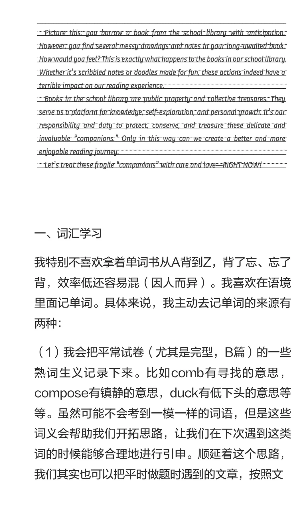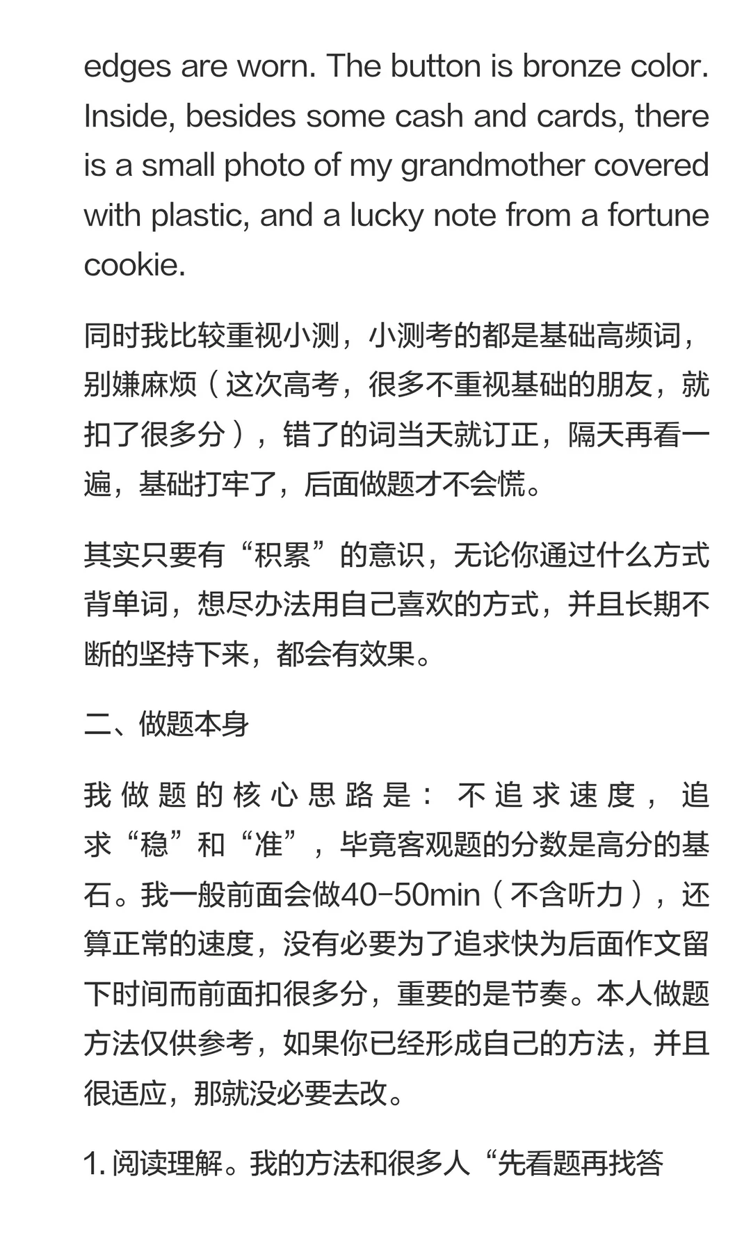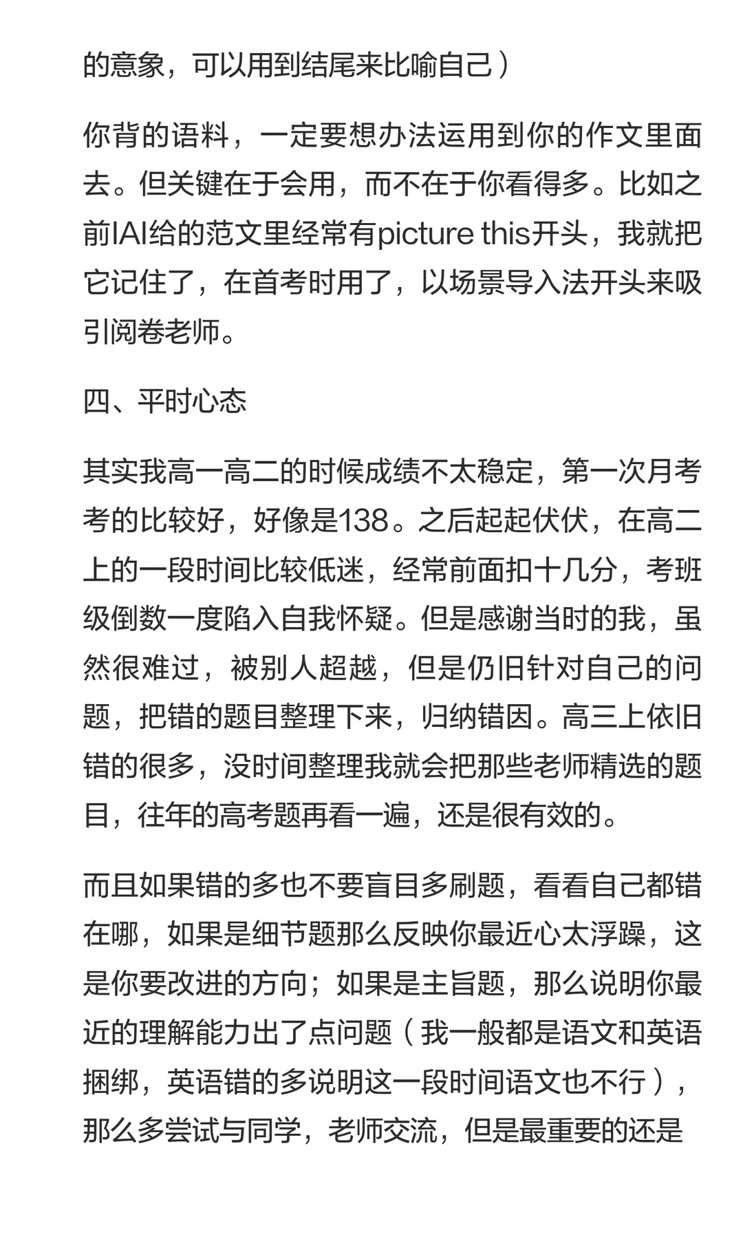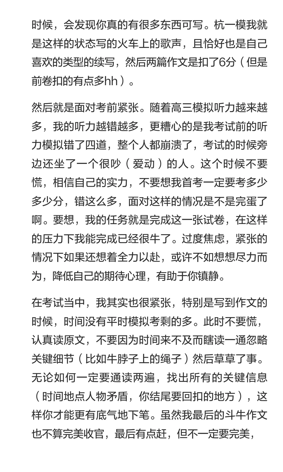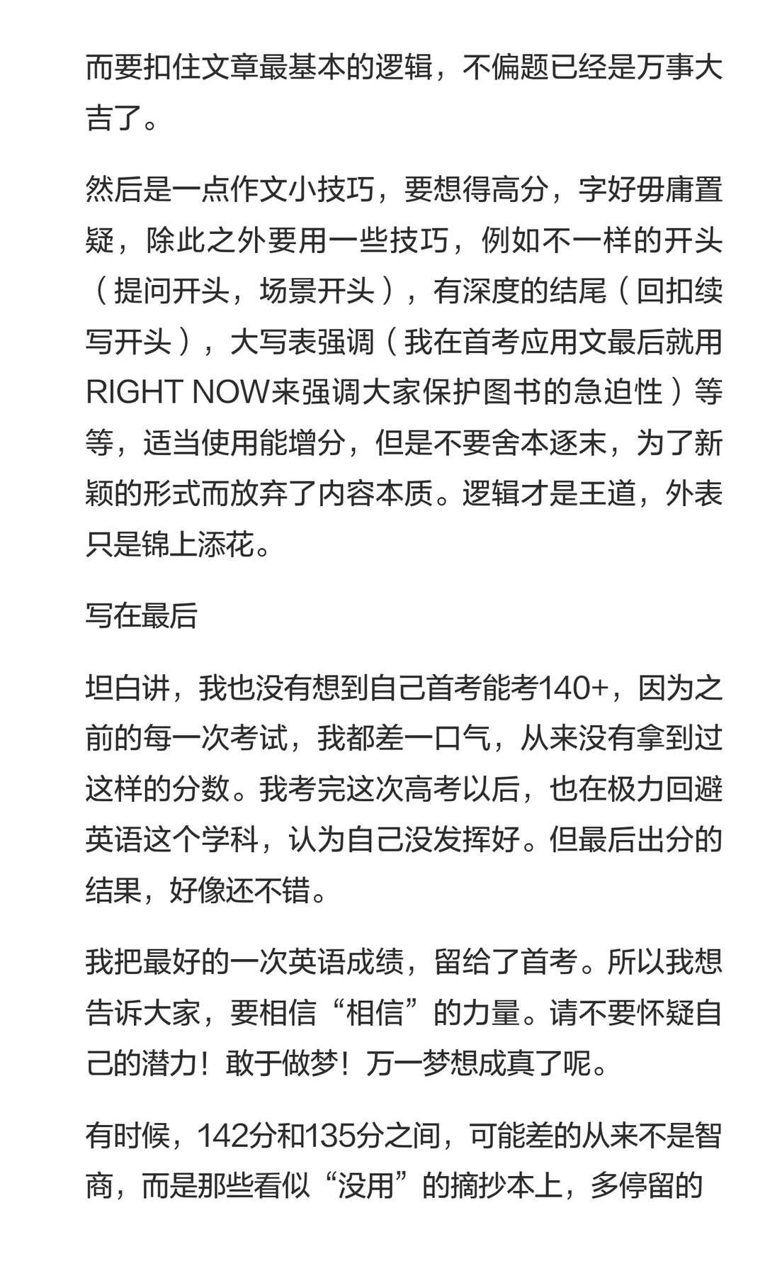 小6同学这次前卷扣分在3分,最后得分是142分,所以她的两篇作文在35分(算是浙江“天花板”级别的作文得分了,一般浙江的两篇作文最高分在36-37分)。但小6同学在英语备考的路上并不是一帆风顺的,也有过“坎坷”。所以我们也希望能够通过小6的这篇文章,鼓励一些还在英语高考这件事上努力的朋友们。