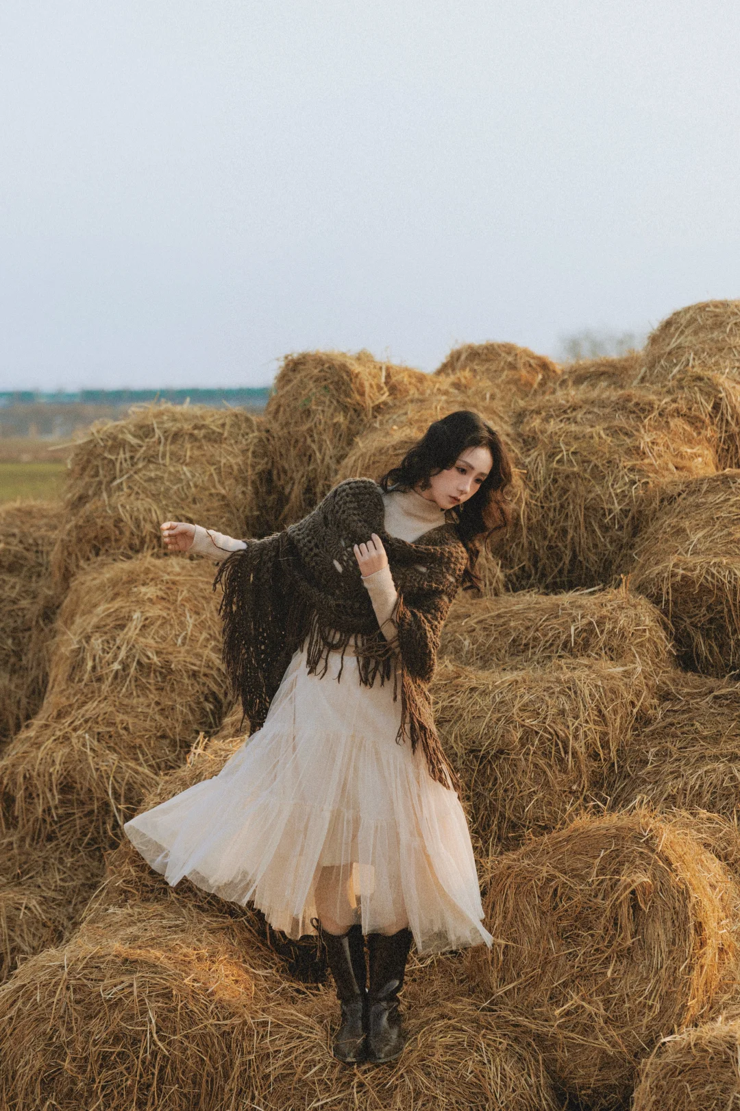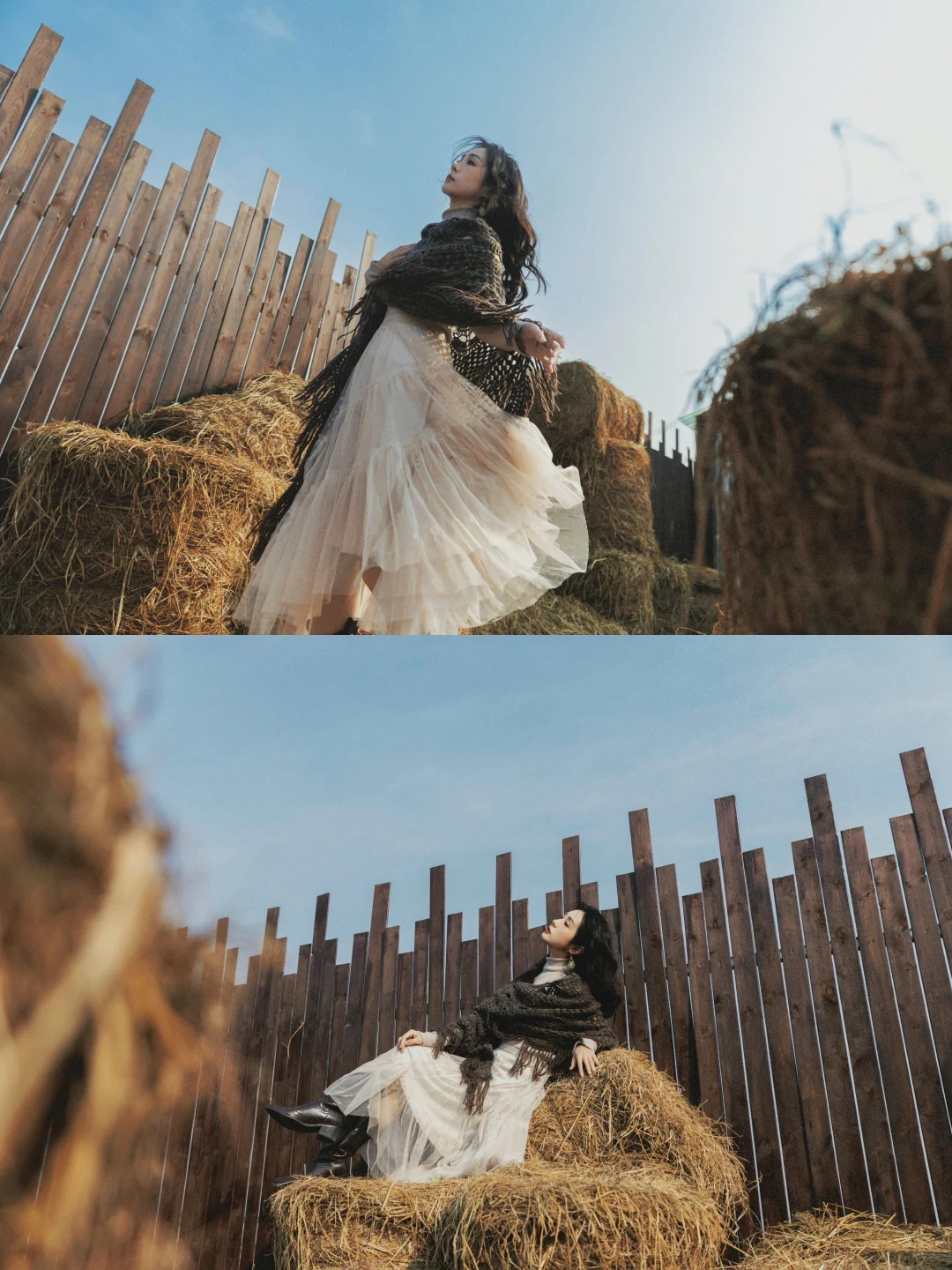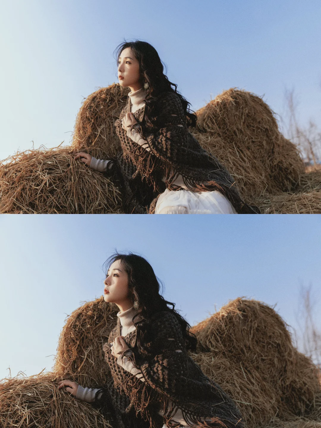 ✓光线运用:优先侧逆光 / 逆光,发丝会被阳光镶上金边,草垛也会呈现暖金色,氛围感直接拉满;顺光拍则更清晰,适合拍全身照
