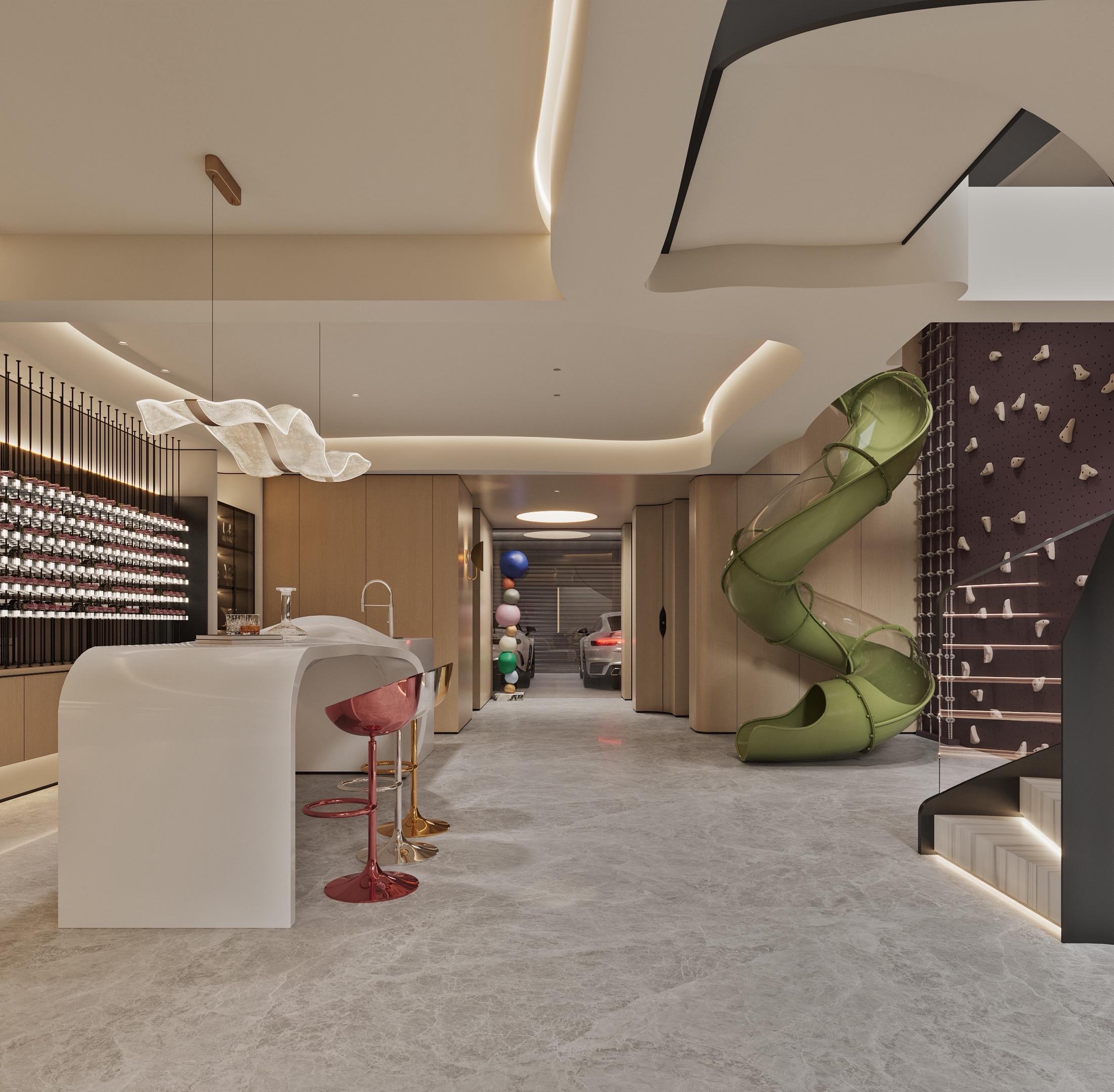 昆明别墅地下室逆天改造!亲子空间+ 滑梯。👉 地下室=杂物间?NO!滑梯、绘本角、亲子咖啡吧… 昆明联排别墅设计