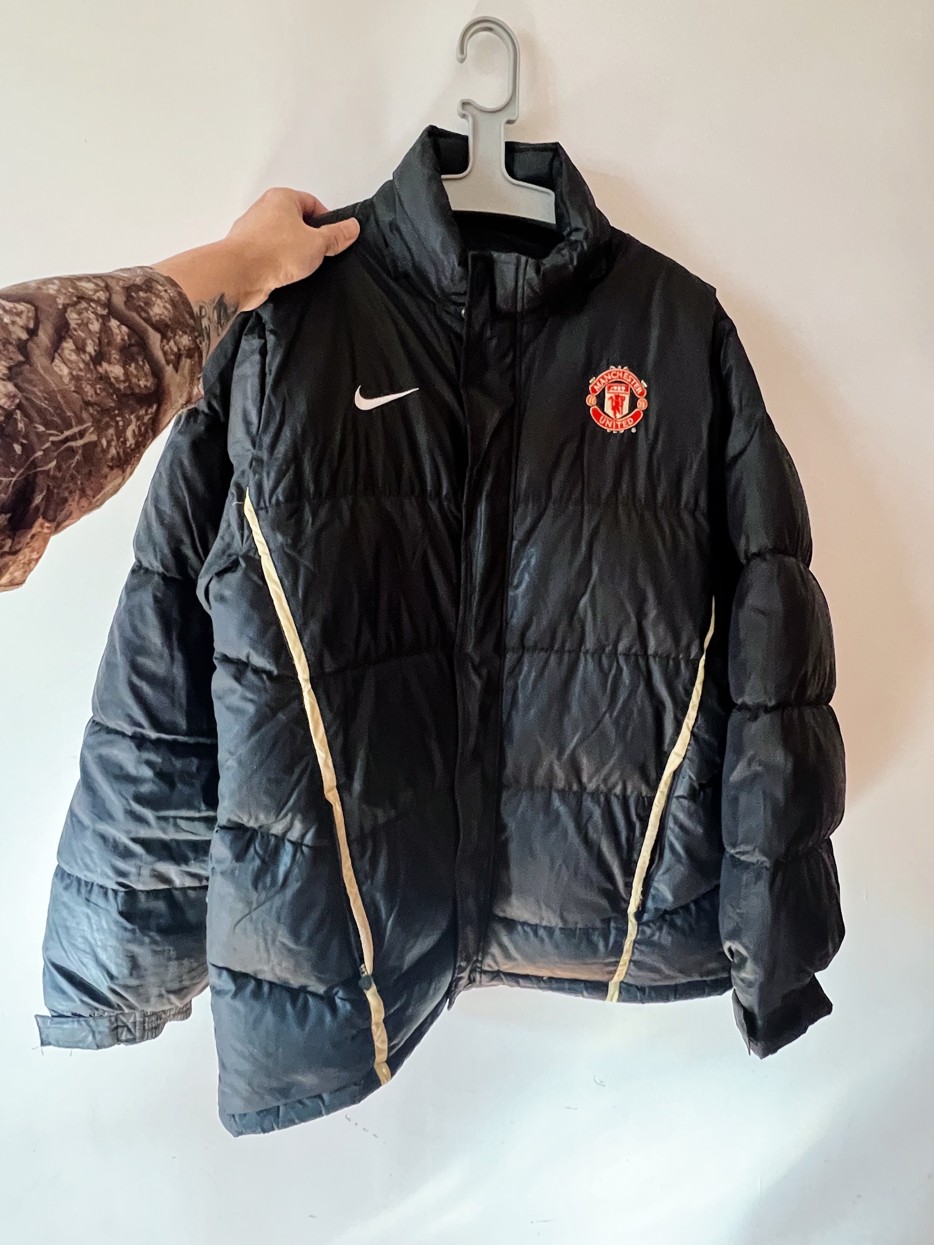 衣身两侧的金色条纹一眼穿越回2006/07赛季,黑色羽绒服不用报身份证就能彰显北京市民底色。想把它拿到曼彻斯特穿,L码当年穿着完全是HIP HOP风格,现在穿正合适。