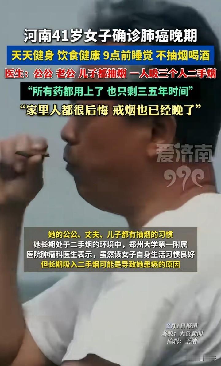 太吓人了,河南郑州一女子被确诊为肺癌,而这位女子天天健身,而且饮食习惯也健康,9点之前睡觉,不抽烟,不喝酒。没想到被确诊为肺癌晚期。 医生称,女子的公公,老公,儿子都吸烟,一个人吸三个人的二手烟。女子长期生活在这种环境,导致肺癌发生。 所有药都用上了,只剩几年时间。看到这,真替女子惋惜,希望战胜病魔,奇迹会发生。 对此家里面非常自责,希议尽量避免在公共区域吸烟。 希望大家引以为戒。吸烟有害健康,这是毋庸置疑的,只是每个人的体质看能不能消化。 对此你们怎么看呢?