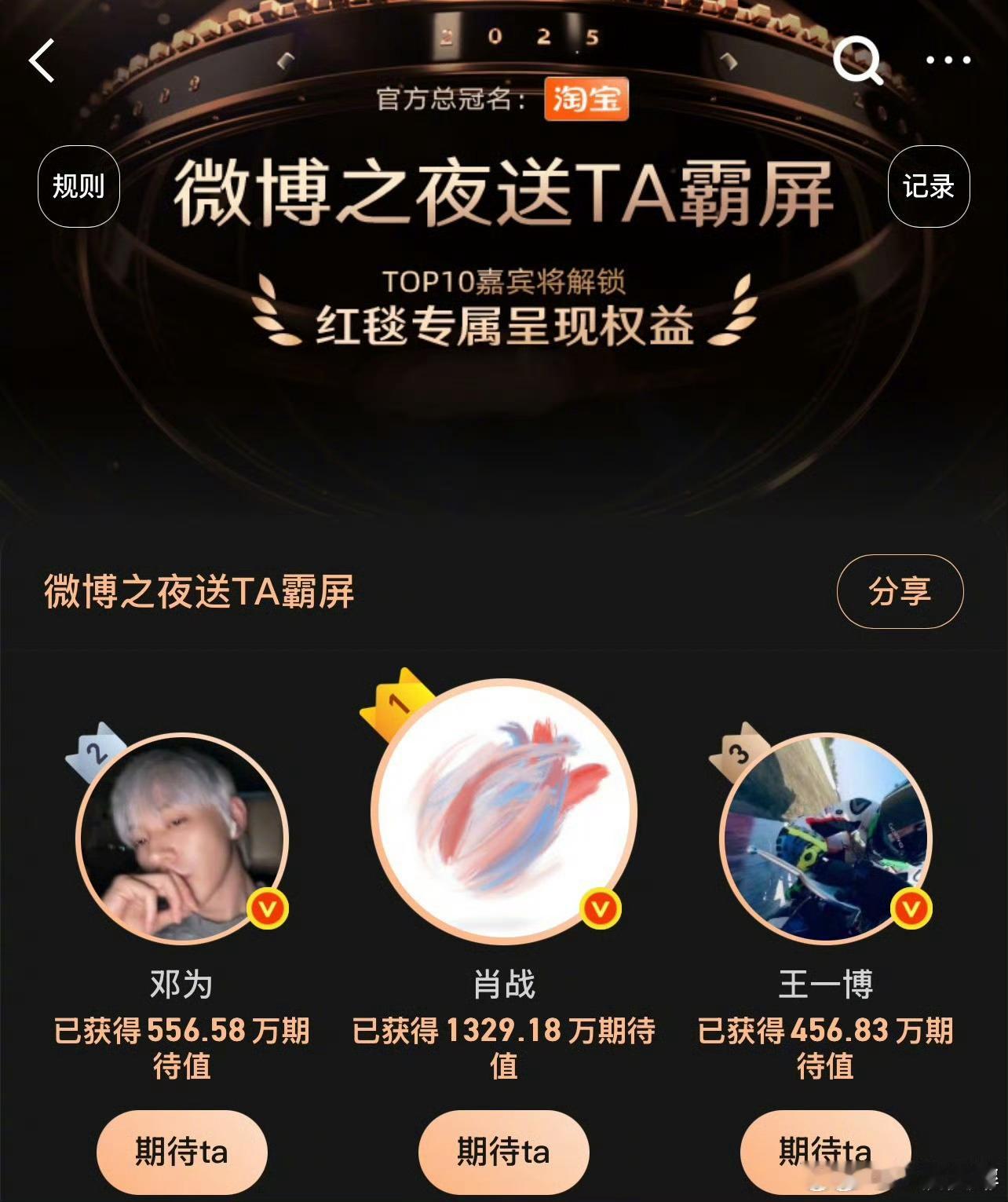 微博之夜霸屏投票TOP10肖战、邓为、王一博、刘宇、时代少年团、汪苏泷、十个勤天、杨幂、丁禹兮、陈丽君