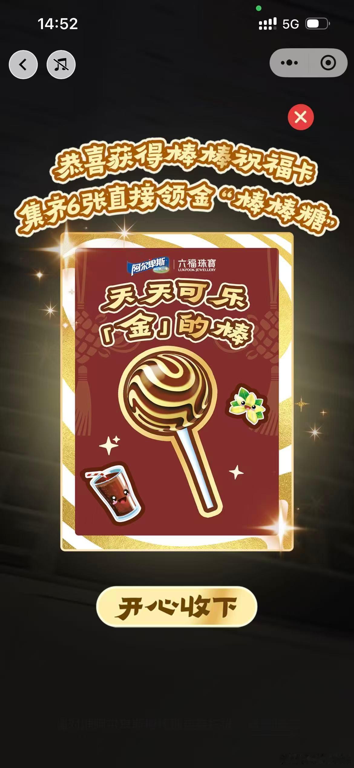 无痛攒金攻略祝你金的结么棒 集卡进度5/6!就差最后一张就能兑换阿尔卑斯足金棒棒糖。还没开始的宝子,扫包装0元抽真金,一起冲!阿尔卑斯棒棒糖