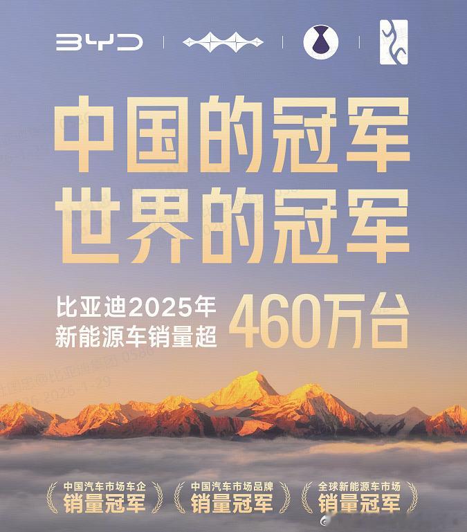 2025 年中国汽车市场年度榜单揭晓,比亚迪以全年超 460 万辆的销量,包揽中国汽车市场车企、品牌销量冠军,还连续四年卫冕全球新能源汽车市场销量冠军,彰显世界冠军硬核实力。