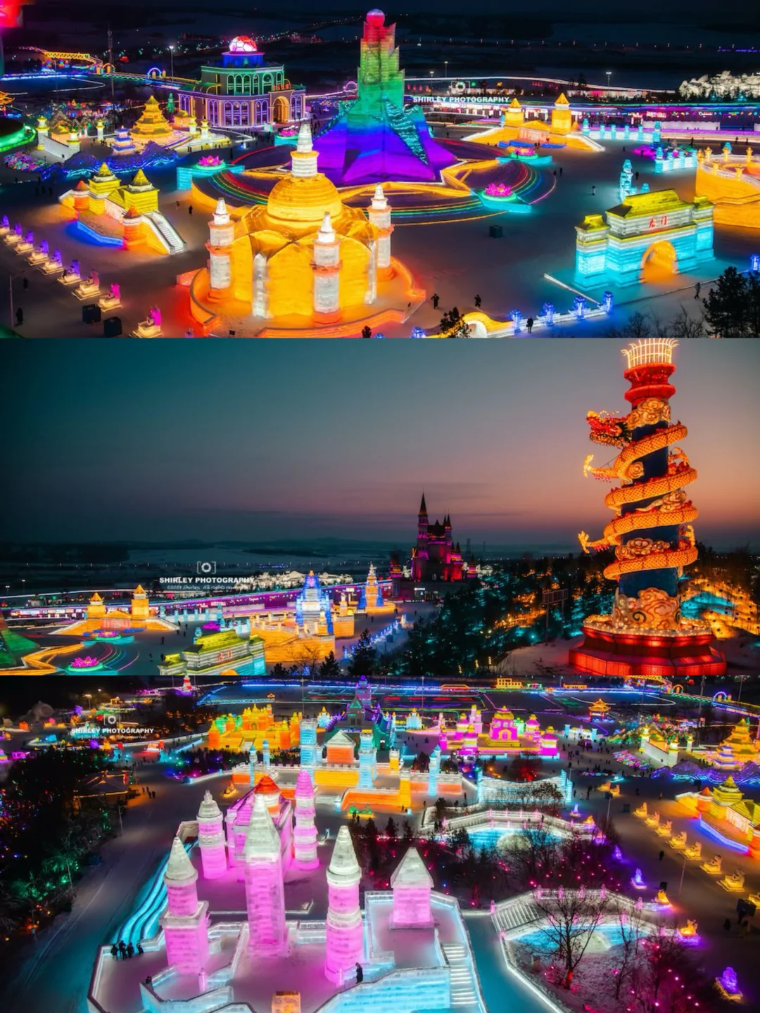 园区内70+条冰雪滑梯(最🔥的是1314和520),200+冰雕拍到爆卡,还有每年都有的冰瀑与雾凇景观。傍晚登上免费观景台,亮了灯的冰雕特别梦幻!