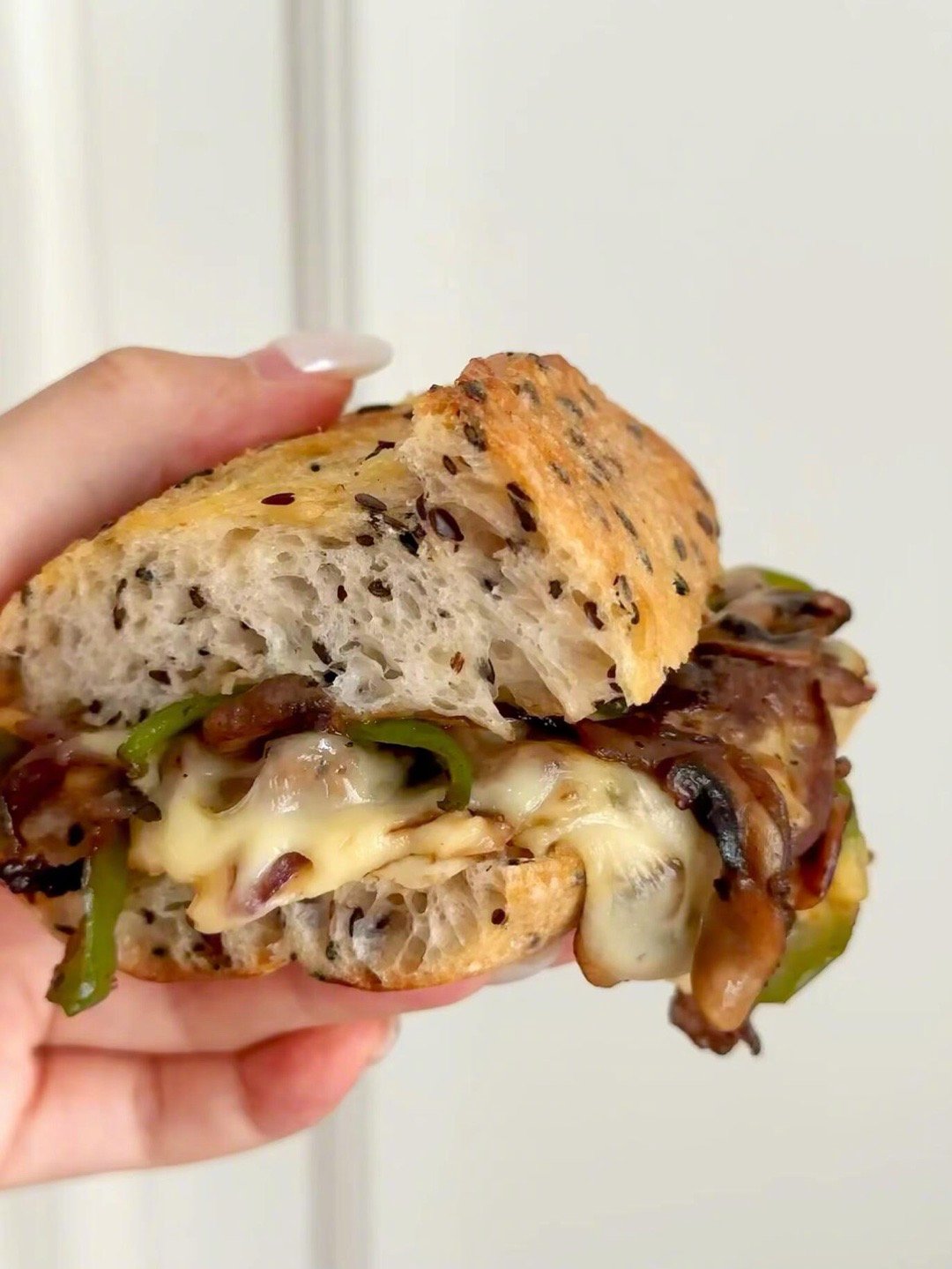 法棍新吃法|川味菌菇牛肉太上头了❗️最近迷上这种烤得焦脆外壳的粗粮法棍🥖内里是有嚼劲 韧韧湿润的口感口蘑的菌菇香气:牛肉的焦香辣再铺会拉丝的芝士片➕奶香扎实的口感 一定要试试!-亚麻籽的颗粒感让整个三明治更有层次整体咸香浓郁~保证吃上一口就爱上!是健康又hin稳定食欲的一餐🍴三明治一人食吃什么一人食健康