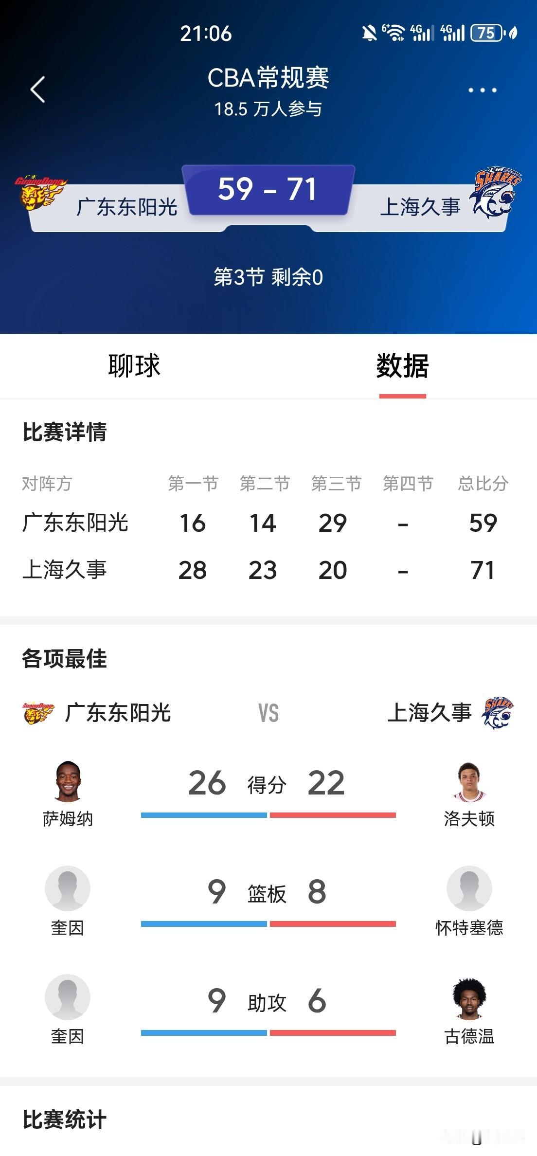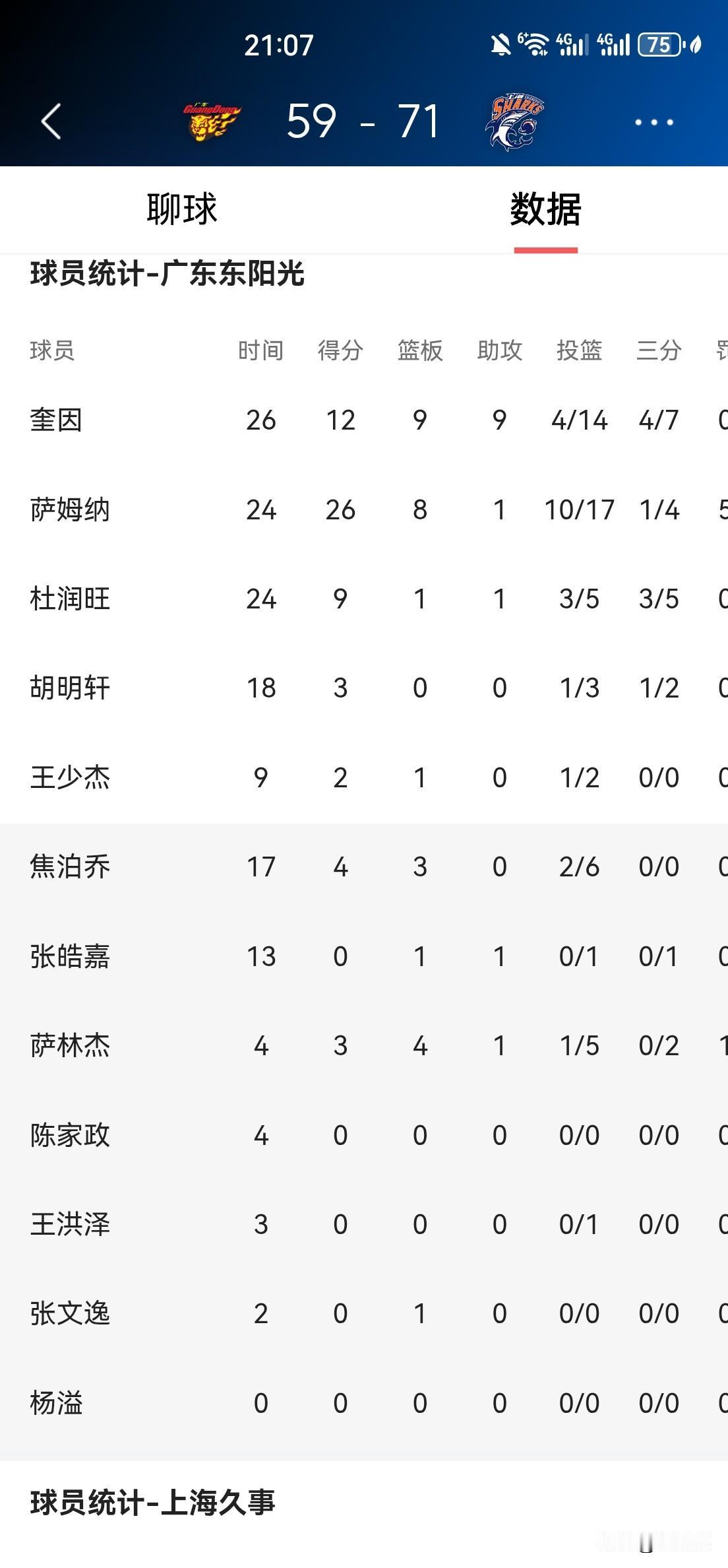 杜锋指导名言“20分算个P”重现? 第三节广东队疯狂反扑,气势如虹,一度从半场落后21分追至仅落后5分! 坏消息是,前三节拿下26分8篮板1助攻的萨姆纳第三节后半段疑是受伤下场,大外援萨林杰也因伤无法上场。好消息是,第4节双方都是单外援出战,广东对本土球员加油! 兑现杜锋指导名言:20分算个“P”! 拿下!