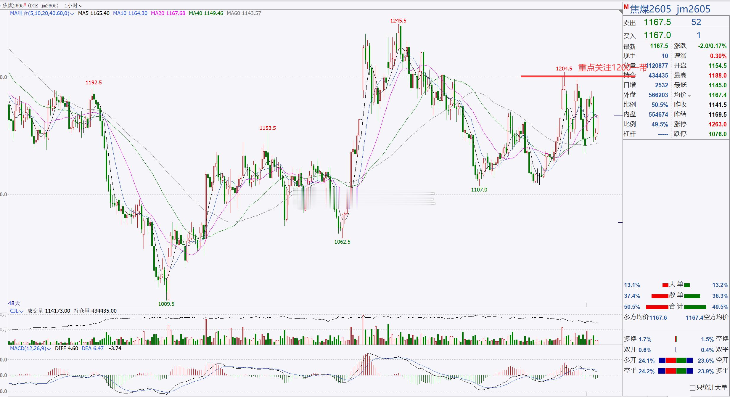 1、【焦煤2605】焦煤关注1200一带,短线跟进!焦煤目前处于横盘调整,后市重点关注1200一带,未能突破延续,建议短线跟进,即可看横盘调整,稳健者建议先观望;例如多关注1145—1135附近,上方关注1190—1200附近;空关注1200突破情况再择机考虑介入;(建议仅供参考,具体操作以开盘点位实时跟进,据此操作风险自担)