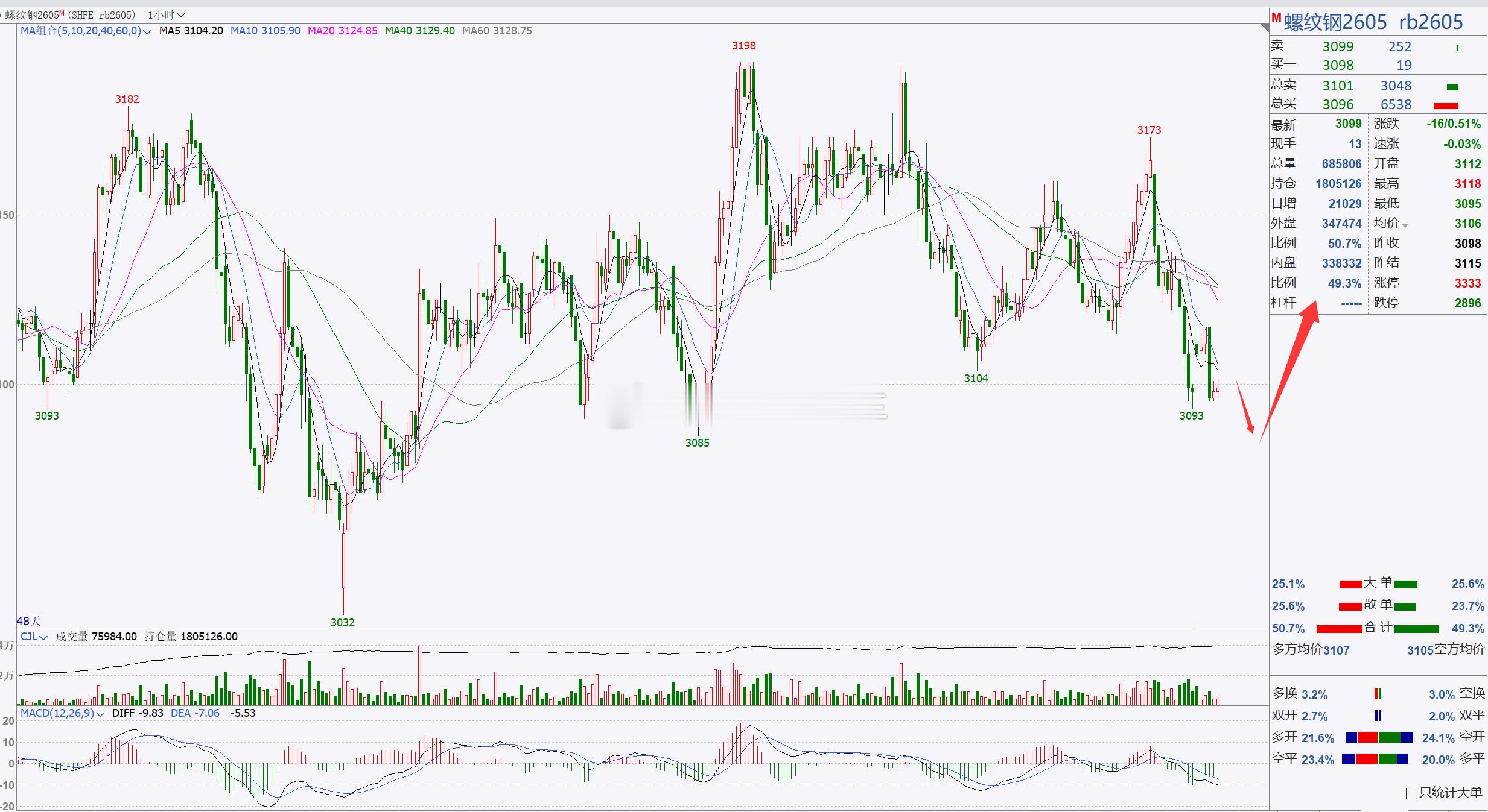 2、【螺纹2605】螺纹后市看横盘调整!螺纹回踩后,目前处于低位横盘调整,后市重点关注3080—3070区域,若此位置未能跌破延续,建议短线跟进,看短期横盘调整;例如多关注3080—3070附近,上方先关注3150附近,突破再关注3180附近;空关注3150、3180这两个位置的突破情况再择机考虑介入;(建议仅供参考,具体操作以开盘点位实时跟进,据此操作风险自担)