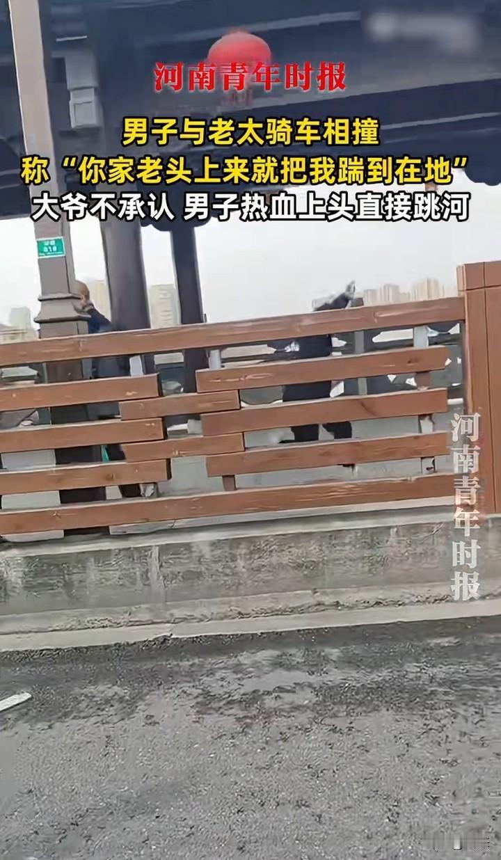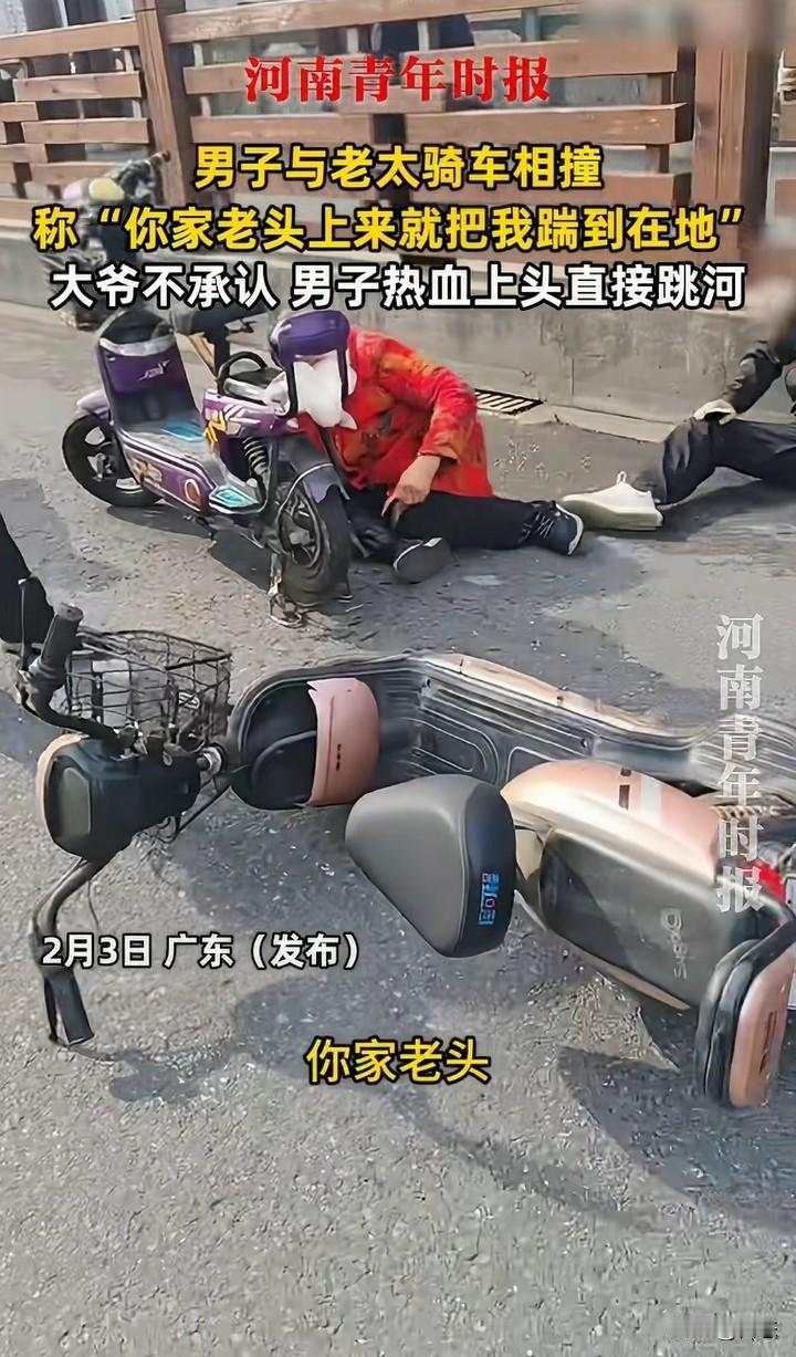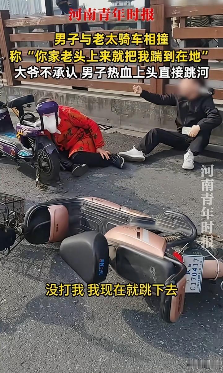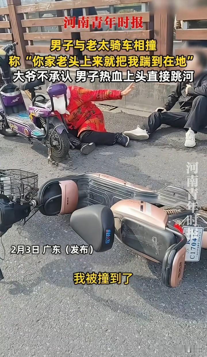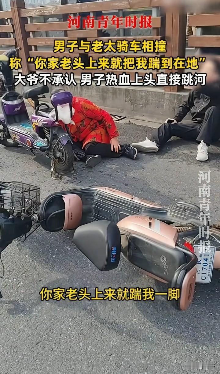 广东一男子和一老人骑着电动车自行车相撞,没想到老太太的老公上来就把男子给踹倒在地,而大爷确不承认,男子为了证明自己没有说谎,突然跑到河边跳下去。希望男子没事! 现在到处都是监控,谁对谁错交警会判断,不是谁不讲道理就是对的。 有些老人明明是自己错了,却表现自己有理一样,而且是无理取闹,希望严惩,打人肯定是不对的。 你们怎么看呢?老头凭什么踹男子?这不是没事找事吗?
