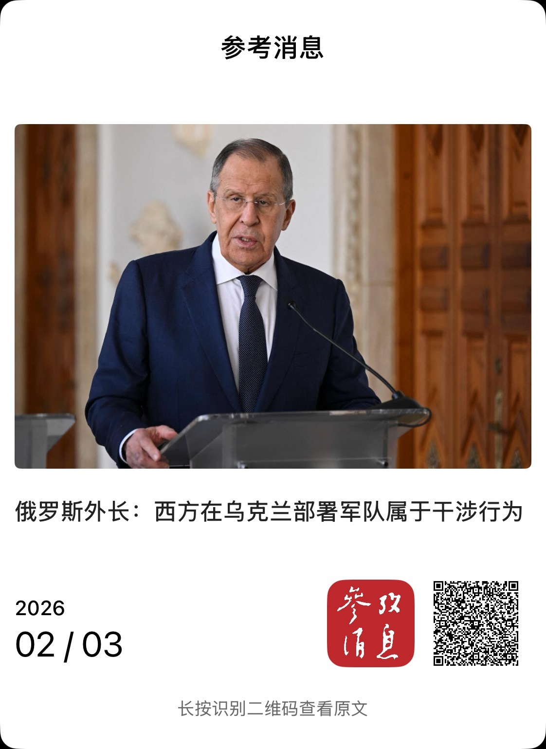 [ 相关报道 ] 俄罗斯外长:西方在乌克兰部署军队属于干涉行为(参考消息 2026-02-03 21:47:37 )