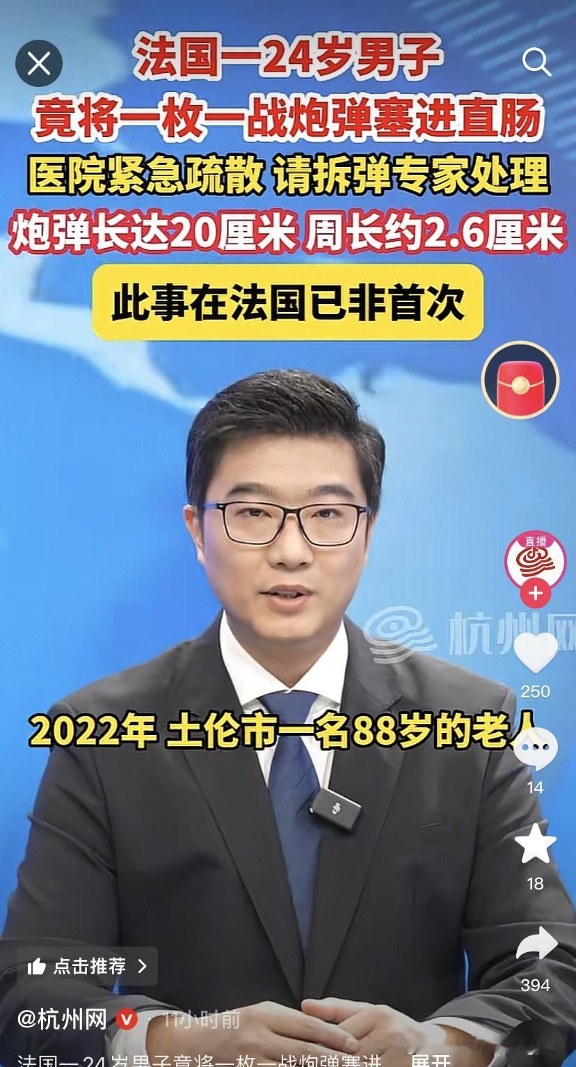法国人还是会玩! 去年看新闻说国内有个60多岁的老汉把红薯塞进肛门,然后有个小伙把玩具塞进肛门。 法国有人玩得更高难度。 法国一个24岁男的,竟然把一战时候的一枚炮弹塞进直肠,跑到医院去了,把医院吓得赶紧疏散人群,找到拆弹专家处理。 这个炮弹长20厘米左右,周长2.6厘米,好吧,这个有点可怕了,要是这玩意爆了,那还得了? 就这还在法国并非个例。 2022年,法国土伦一个88岁老汉,也干过这事! 好吧,这法国人还是会玩。 在国内影视的奇葩剧情就有裤裆藏雷,这法国人直接上演真的:直肠藏弹! 有需求,人能理解,但是这塞炮弹,这就有点太厉害了,要是这炮弹炸了,那后果不堪设想!