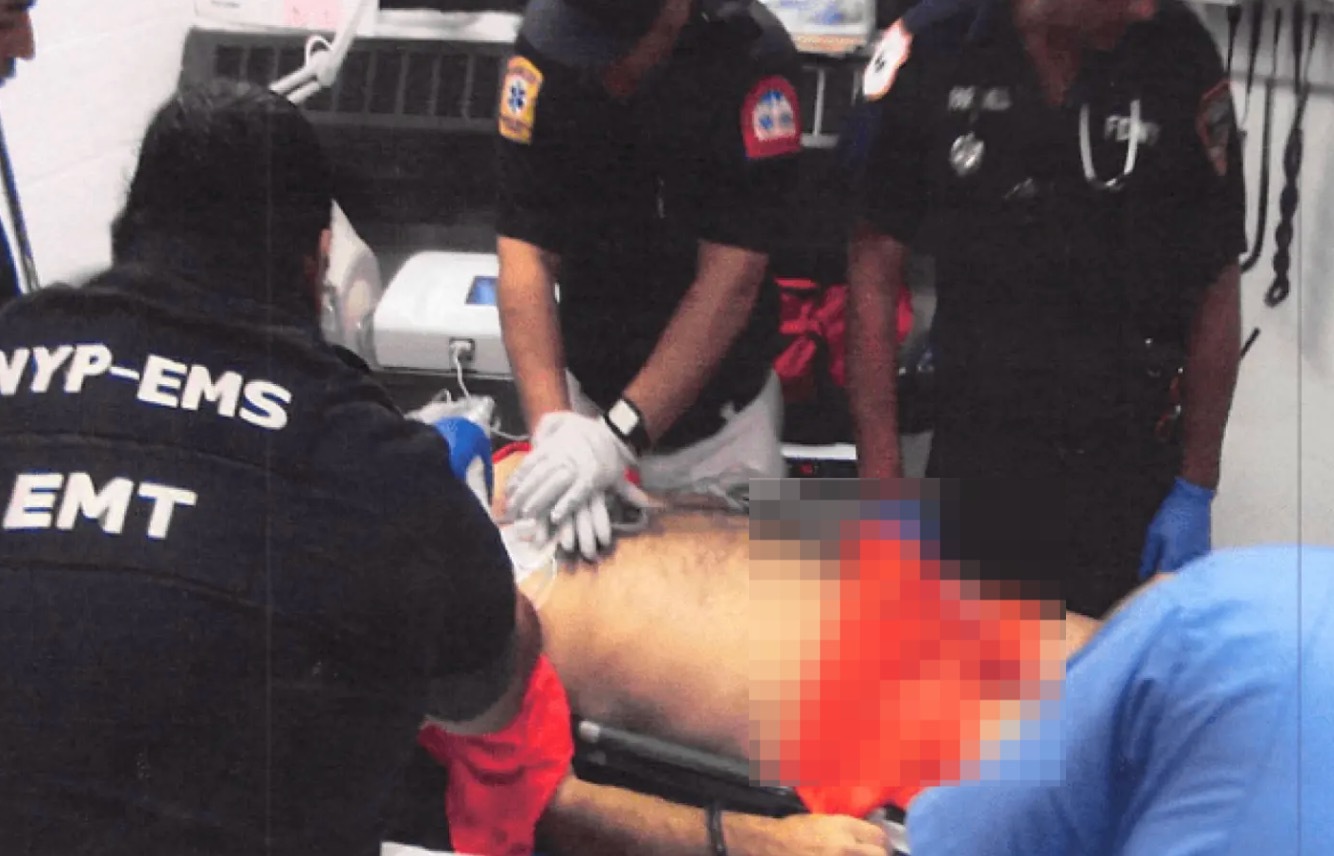 其中一份被司法部标记为“EFTA00134598”的文件图片显示,爱泼斯坦身穿橙色囚服,衬衫被撕开,一名急救人员正在对他进行心肺复苏。图片显示,爱泼斯坦裸露的胸部贴着TENS电极片(心肺复苏过程中常见的电极贴片)。
