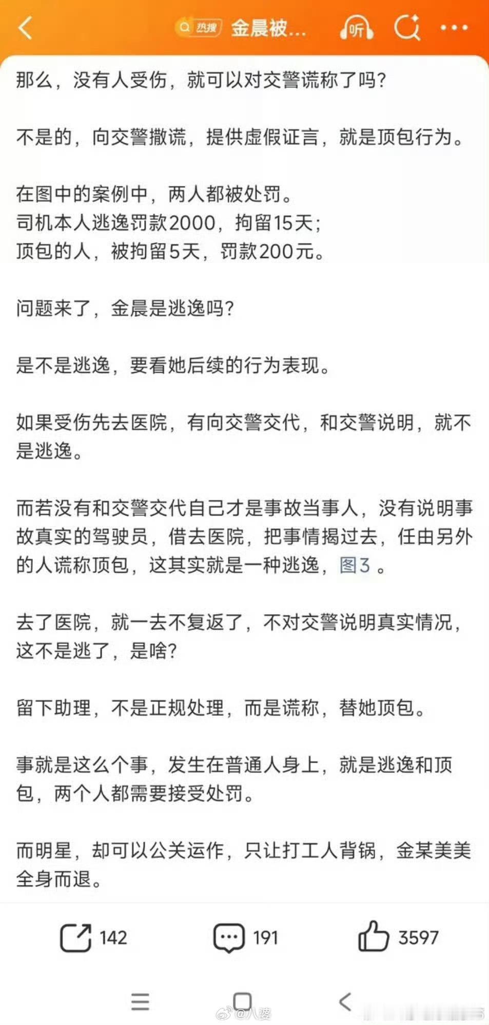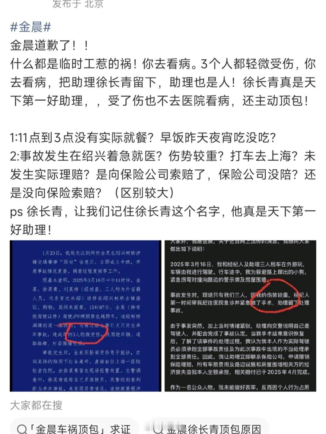 金晨道歉后为何仍被揪着不放我感觉还可能有一个原因,警方公布的材料里面三人都是轻微受伤,然而金晨道歉里面称自己是受伤严重,并没有提及助理受伤。所以助理也是带着伤处理的后续,而金晨的意思是她不知道助理给她顶/包,这么一说,助理又遭着罪,犯法的也是助理。可能这些细节让网友不得不深究。