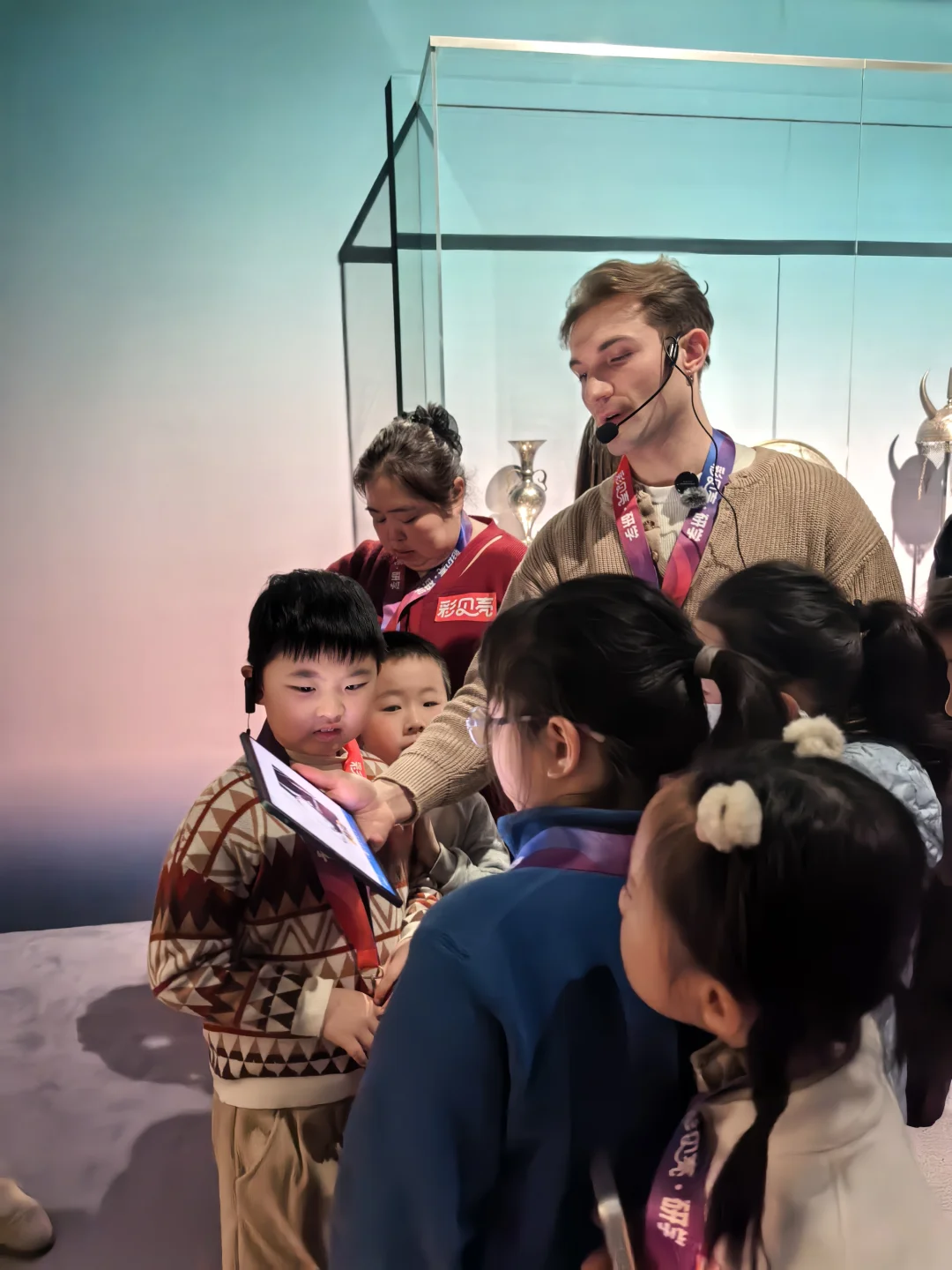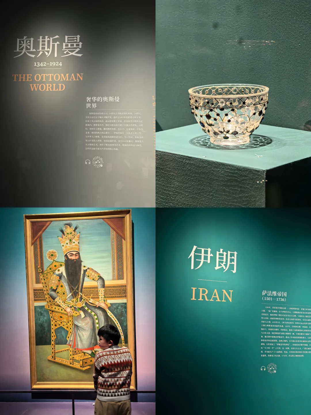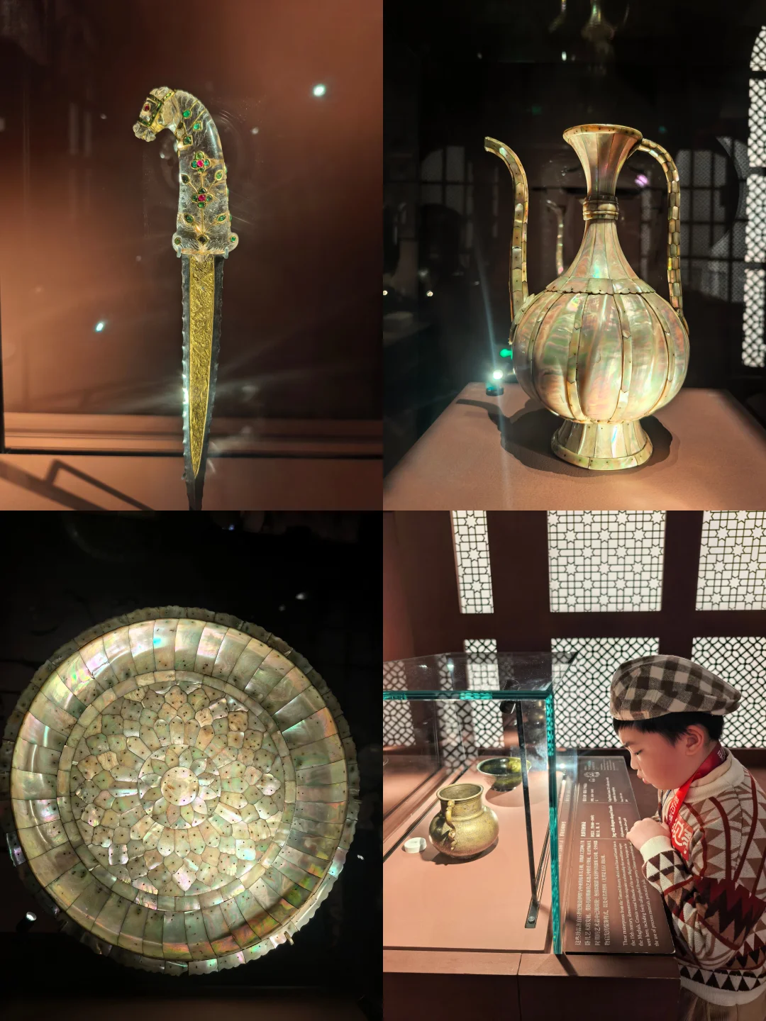 这个展览有近300件卢浮宫馆藏珍品,通过丝绸之路能看到精美的丝毯、壁画和手稿 。老师带我们领略了东方装饰艺术的魅力,像印度的马首柄匕首,镶嵌着金、红宝石和祖母绿,工艺超级精湛。还有伊朗的赛诗会饰板,由63块陶砖拼接而成,老师给我们讲了上面的图案和文化寓意,孩子还问了好多关于古代波斯文化的问题呢。