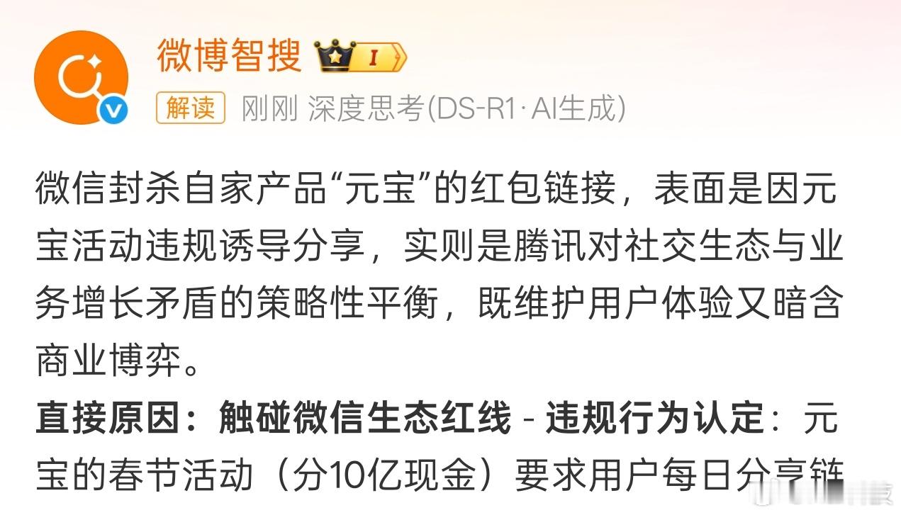 早~其实不用阴谋论,就是微博智搜总结的,既想要维护用户体验又存在商业博弈,扯到其他就没啥意思了……微信微信为什么要打自家人元宝