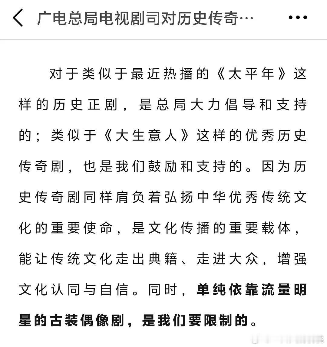 gd对历史传奇剧创作提出要求: 大力倡导和支持历史正剧,鼓励优秀历史传奇剧,限制纯依靠流量明星的古偶。