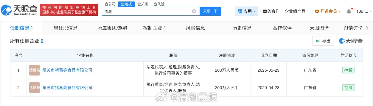 【#猪葛亮已被申请注册为商标#,#周瑜去年成立猪葛亮相关企业#】#诸葛亮后人要求撤销猪葛亮商标#近日,广东东莞一家名为“猪葛亮食品有限公司”的企业引发关注。公开信息显示,其法定代表人名为“周瑜”。记者查询天眼查任职信息发现,周瑜名下关联2家企业,均为存续状态,包括东莞市猪葛亮食品有限公司、韶关市猪葛亮食品有限公司,周瑜在上述公司担任法定代表人、经理等职务。其中,韶关市猪葛亮食品有限公司成立于2025年5月。知识产权信息显示,“猪葛亮”已被多方申请注册为商标,申请人包括惠州市某网络有限公司、四川某商贸有限公司等,国际分类涉及食品、方便食品等,当前商标状态多为已注册。 东莞