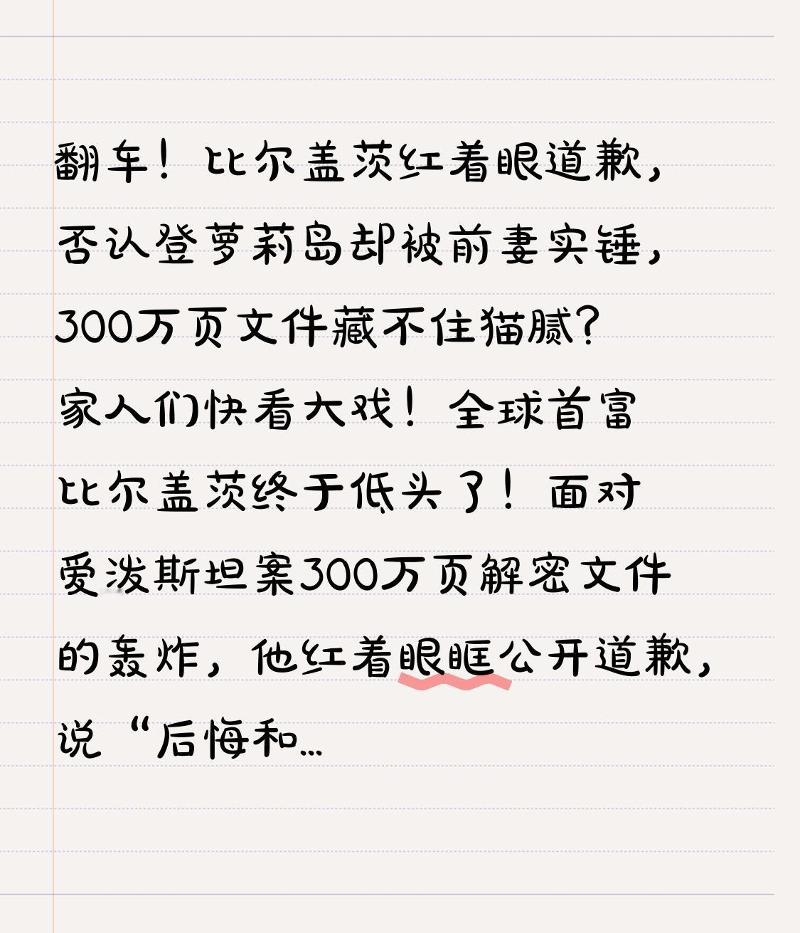 翻车!比尔盖茨红着眼道歉,否认登萝莉岛却被前妻实锤,300万页文件藏不住猫腻? 家人们快看大戏!全球首富比尔盖茨终于低头了!面对爱泼斯坦案300万页解密文件的轰炸,他红着眼眶公开道歉,说“后悔和爱泼斯坦相处的每一分钟”,却一口咬定没登过萝莉岛、没碰过涉案女性。可这番声泪俱下的辩解,不仅没平息舆论,反而被网友骂上热搜第一,这到底是清白蒙冤还是公关洗白? 事情的导火索,是美国司法部1月底曝光的一封诡异邮件——这是爱泼斯坦2013年写给自己的未发送草稿,里面把盖茨骂惨了:说他婚内和俄罗斯女孩发生关系,染病后求爱泼斯坦给抗生素,还想偷偷给前妻梅琳达喂药隐瞒!虽然没有第三方证据佐证,但这瓜一爆,比尔盖茨道歉话题几小时讨论量破3亿,网友直接炸了锅。 重压之下,盖茨2月4日首度正面回应。镜头前的他满脸懊悔,反复强调和爱泼斯坦往来“只为慈善”,想借助对方人脉给基金会募资,可三年多下来啥合作都没成,现在只剩后悔。对于核心指控,他更是斩钉截铁否认:“那封邮件是假的!我从没上过他的岛,也没见过那些女性!” 可转折点来了,网友随手一扒就找出一堆漏洞!盖茨之前明明承认和爱泼斯坦“多次会面”,现在却改口“仅几次晚宴”;还有实锤显示他曾坐爱泼斯坦的私人飞机跨洲赴约,难道谈慈善需要这么兴师动众?更致命的是,文件还曝光盖茨通过摩根大通,给爱泼斯坦旗下基金会转了6笔“慈善咨询费”,总额超300万美元,可那个基金会压根没公开过任何慈善项目! 最让盖茨难以自圆其说的,是前妻梅琳达的隔空补刀。2月3日梅琳达首度发声,一句“勾起了婚姻中非常痛苦的回忆”,瞬间戳破盖茨的谎言。要知道,当初两人离婚的关键原因,就是梅琳达多次警告盖茨远离“恶魔”爱泼斯坦,可盖茨根本不听。现在梅琳达早已辞去盖茨基金会职务,成立独立机构彻底切割,还说“很高兴远离那片污秽”,这态度还不够明显吗? 其实网友愤怒的从来不是真假难辨的邮件,而是精英阶层的双重标准。一边是捐几百亿高喊慈善的道德楷模,一边是明知对方是性犯罪者,还为了利益往来的精致利己者。盖茨后悔的哪里是交友不慎,分明是后悔自己被曝光,毁了经营几十年的完美人设! 这场道歉翻车早就说明:财富和权力或许能买到人脉和声誉,却买不到真心的信任。当精英的遮羞布被撕开,剩下的只有赤裸裸的私心。盖茨的辩解越用力,反而越显得心虚。 你觉得盖茨是被冤枉的,还是公关洗白?那些消失的证据里还藏着什么?评论区聊聊你的看法,点赞关注,后续有新爆料第一时间更新!