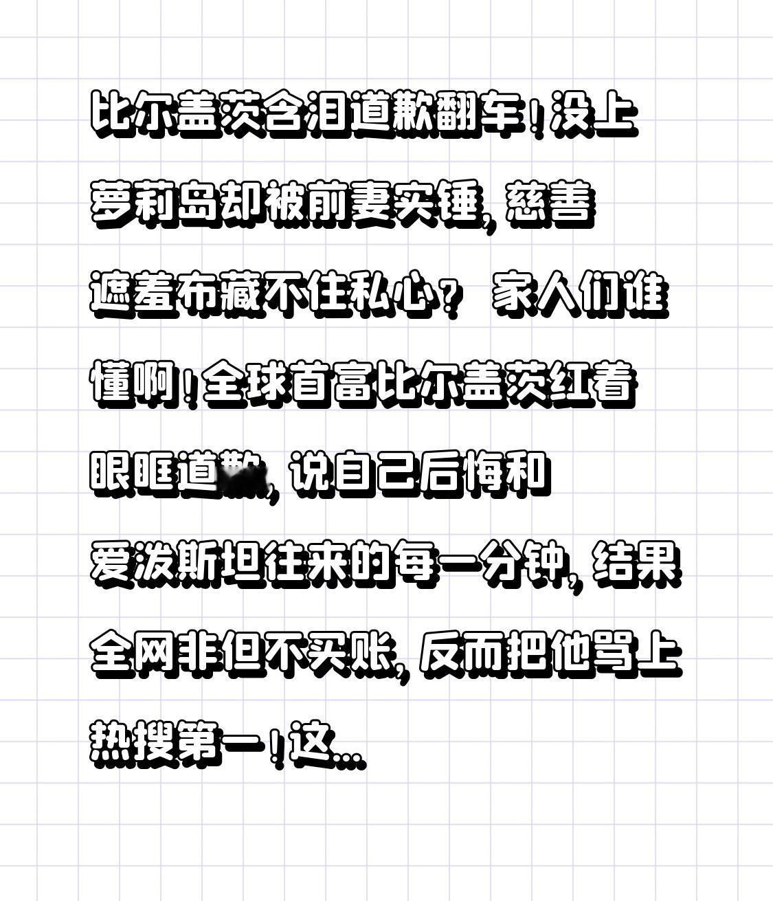 比尔盖茨含泪道歉翻车!没上萝莉岛却被前妻实锤,慈善遮羞布藏不住私心? 家人们谁懂啊!全球首富比尔盖茨红着眼眶道歉,说自己后悔和爱泼斯坦往来的每一分钟,结果全网非但不买账,反而把他骂上热搜第一!这到底是委屈的澄清,还是精心策划的公关秀? 事情得从300多万页解密文件说起,爱泼斯坦案的一封未发送邮件,直接把盖茨推下神坛。邮件里写得明明白白:盖茨婚内和外籍女性发生关系,染病后竟想让爱泼斯坦给抗生素,偷偷给前妻梅琳达喂药隐瞒!这瓜一爆,网友直接炸了锅,比尔盖茨道歉话题几小时讨论量破3亿。 重压之下盖茨终于回应,镜头前的他满脸懊悔,说和爱泼斯坦往来只是为了慈善募资,还斩钉截铁否认去过萝莉岛、见过涉案女性。可这番说辞刚出口,就被网友扒出满是漏洞:之前明明承认“多次会面”,现在改口“几次晚宴”;都坐过对方私人飞机跨洲赴约了,还说只是谈慈善?这借口连小学生都不信吧! 更致命的是前妻梅琳达的隔空补刀,一句“勾起婚姻中非常痛苦的回忆”,再加上“远离那片污秽”的表态,直接坐实了盖茨的说法纯属洗白。要知道当初两人离婚,就是因为梅琳达多次警告盖茨远离“恶魔”爱泼斯坦,可盖茨根本不听。现在梅琳达都成立独立慈善机构彻底切割,这态度还不够明显吗? 其实网友愤怒的从来不是真假难辨的邮件,而是精英阶层的双重标准。一边是捐几百亿高喊慈善的道德楷模,一边是明知对方是性犯罪者,还为了利益往来的精致利己者。盖茨后悔的哪里是交友不慎,分明是后悔自己被曝光,毁了经营几十年的完美人设! 这场道歉翻车告诉我们:财富和权力或许能买到人脉和声誉,却买不到真心的信任。当精英的遮羞布被撕开,剩下的只有赤裸裸的私心。你觉得盖茨是被冤枉的,还是公关洗白?评论区聊聊你的看法,点赞关注,后续有新进展第一时间更新!