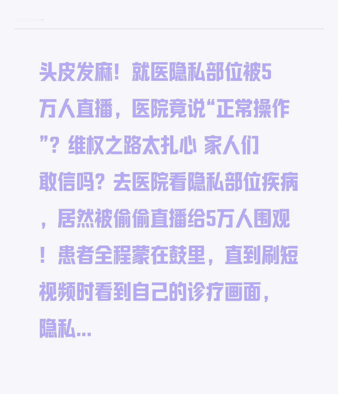 头皮发麻!就医隐私部位被5万人直播,医院竟说“正常操作”?维权之路太扎心 家人们敢信吗?去医院看隐私部位疾病,居然被偷偷直播给5万人围观!患者全程蒙在鼓里,直到刷短视频时看到自己的诊疗画面,隐私成了别人赚钱的工具,这样的就医环境,谁还敢放心看病? 这事发生在河南一家私立医院,32岁的王女士因为妇科问题就诊,全程被要求脱掉衣物检查。可她万万没想到,医生的手机就藏在诊疗床侧面,正对着隐私部位直播,直播间里5万多人疯狂刷礼物、发低俗评论,甚至有人截图传播!更恶心的是,主播还在镜头前讲解“病情”,把患者的痛苦当成博眼球的素材。 更让人气愤的转折点来了!王女士发现后找医院讨说法,院方居然轻描淡写:“这是教学直播,行业常规操作”,还说“你签的知情同意书里写了”。可王女士拿出协议一看,里面只写着“允许临床教学”,压根没提直播、上网!更离谱的是,调查发现这家医院长期靠直播诊疗画面吸粉,涉及妇科、肛肠科等多个隐私科室,受害者多达上百人,有些患者的视频还被卖到境外网站。 但反转还在后头!王女士报警后,警方却表示“难以认定刑事犯罪”,因为医院声称“直播前模糊了面部”,可网友一眼就能通过纹身、疤痕认出当事人。维权时更难:医院拒绝提供直播录像,平台以“用户上传”为由推脱责任,律师说这类案件举证难、赔偿低,很多受害者最后只能不了了之。 其实这种事早就不是个例!去年山东某医院肛肠科医生,把患者手术过程拍成短视频发朋友圈;广东一家医美机构,直播女性隆胸手术吸引客户;更有甚者,有些医院把实习生围观隐私部位诊疗,说成是“教学需要”,完全不尊重患者意愿。 网友们彻底炸了:“就医隐私不是公共资源,谁给的胆子直播?”“每次去看隐私科室都提心吊胆,就怕被偷拍!”“医院的知情同意书全是霸王条款,根本没机会细看!” 确实,我们去医院是求医问药,不是给别人当“展品”,隐私部位的诊疗、手术,本该是最私密的场景,却成了某些人牟利的工具,这背后是医院的漠视、监管的漏洞,更是对患者尊严的践踏。 说到底,就医安全感是底线中的底线。医院不能把“教学”“营销”当成侵犯隐私的借口,监管部门更该加大查处力度,让偷拍直播的医院和个人付出代价。每一个患者都有权利要求隐私被尊重,每一次就医都该被温柔以待。 你有没有过就医时被侵犯隐私的经历?该怎么守护我们的就医安全?评论区聊聊你的看法,点赞关注,一起呼吁重视医疗隐私,不让更多人受伤害!