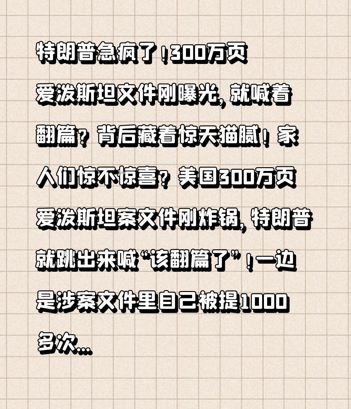 特朗普急疯了!300万页爱泼斯坦文件刚曝光,就喊着翻篇?背后藏着惊天猫腻! 家人们惊不惊喜?美国300万页爱泼斯坦案文件刚炸锅,特朗普就跳出来喊“该翻篇了”!一边是涉案文件里自己被提1000多次,一边是急着转移公众注意力,这波操作到底是欲盖弥彰,还是真有隐情? 这事得从特朗普的“竞选承诺”说起。2024年竞选时,他把爱泼斯坦案吹成“民主党黑料”,拍着胸脯说上台就全公开。结果2025年1月上任后,文件公布直接停滞,直到国会硬逼着通过《爱泼斯坦档案透明法》,司法部才磨磨蹭蹭在年底开始分批发布。 可这公布过程全是猫腻!司法部说搜集了600万页文件,结果涂黑后只公开了350万页,剩下的250万页直接消失?更离谱的是,第二批文件刚放出来,近100名受害者的名字和隐私信息居然被完整曝光,引发全网怒喷。受害者律师找上门抗议,司法部才慌忙下架,还狡辩是“技术错误”——谁信啊?这分明是故意遮掩,还顺带报复受害者! 为啥特朗普政府这么急着翻篇?答案就藏在文件里!除了特朗普本人被提及1000多次,还牵扯出他的商务部长、美联储主席提名人、前顾问班农,甚至马斯克、比尔盖茨等一堆政商大佬。更致命的是,文件里有针对特朗普的性侵指控,还有他和爱泼斯坦数十年友谊的细节,虽然没被定罪,但对正在博弈的中期选举来说,简直是致命打击。 更讽刺的是,特朗普一边喊着“翻篇”,一边让共和党发力把脏水泼给克林顿。共和党国会逼着克林顿夫妇出庭作证,想转移焦点,可民主党直接反问:“为啥不查特朗普和爱泼斯坦的往来?” 现在两党把受害者的痛苦当成政治武器,互相攻讦,唯独没人在乎那些被伤害的人。 其实明眼人都看得明白,特朗普急着翻篇,根本不是为了“国家注意力”,而是怕更多黑料被扒出来。承诺公开却刻意拖延,公开文件又大量涂黑,泄露受害者信息还甩锅技术错误,这一系列操作全是为了掩盖权贵圈子的丑闻。 这场闹剧早就不是简单的案件调查,而是美国权贵阶层的遮丑大会。所谓的“透明法案”成了政治博弈的工具,受害者的正义遥遥无期。说到底,特朗普政府越急着翻篇,越证明他们心里有鬼。 你觉得那些消失的250万页文件里藏着什么?特朗普真能全身而退吗?评论区聊聊你的看法,点赞关注,后续有新爆料第一时间更新!