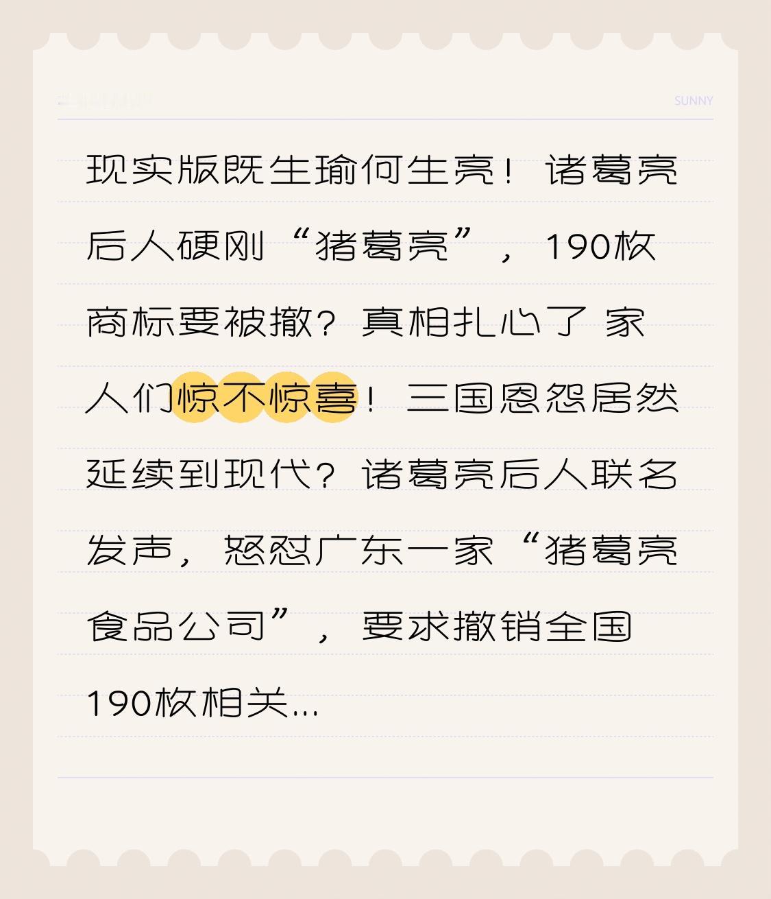 现实版既生瑜何生亮!诸葛亮后人硬刚“猪葛亮”,190枚商标要被撤?真相扎心了 家人们惊不惊喜!三国恩怨居然延续到现代?诸葛亮后人联名发声,怒怼广东一家“猪葛亮食品公司”,要求撤销全国190枚相关商标,更巧的是,这家公司的老板居然叫周瑜!这波“既生瑜何生亮”的现实戏码,到底是恶意蹭热度还是创意营销? 这事得从网友爆料说起,东莞这家“猪葛亮食品公司”2020年就注册了,用“猪”替代“诸”的谐音梗,主营食品批发。本来没人在意,可最近十余名诸葛亮后裔联合发声明,直接把事闹大了!后裔们说,诸葛亮是千古先贤,是家族荣耀,“猪”字自带贬义,用“猪葛亮”当商标就是刻意抹黑,刺痛了全球诸葛后人的心,更会误导青少年对历史人物的认知。 更有意思的转折点来了!面对质疑,老板周女士委屈回应,说名称是自主构思,注册时合法合规,根本没有恶搞的意思。可话音刚落,就宣布春节后注销公司,理由是订单锐减、经营不下去。网友直接乐了:“这不是此地无银三百两吗?” 更讽刺的是,除了这家公司,全国还有近200家“猪葛亮”相关主体,覆盖餐饮、教育等多个领域,大多靠谐音蹭热度引流。 但反转还在后头!律师一句话戳破关键:诸葛亮后人维权难度极大!一方面,民法典规定只有近亲属能替死者维权,诸葛后裔距诸葛亮已超千年,血缘没法举证,根本不算法律上的“适格原告”;另一方面,“猪葛亮”是否构成“不良影响”没明确标准,商标局之前只驳回过1枚相关商标。也就是说,后裔们再愤怒,法律上可能很难赢! 其实这事早就吵翻了天。支持后裔的网友说:“先贤不能被消费,‘猪’字明显是侮辱,换成‘秦烩食品’你能接受吗?” 反对的人则认为:“历史人物是公共资源,谐音梗不算侵权,后裔有点小题大做。” 还有人调侃:“周瑜开‘猪葛亮’公司,这是三国恩怨的现代续集啊!” 可抛开玩笑,这事本质是商业利益和文化尊严的碰撞。现在很多企业为了流量,拿历史名人玩谐音梗、恶意攀附,注册成本才几百块,却能借名人效应快速获利。诸葛亮代表的忠义智慧,是刻在中国人骨子里的文化符号,不该成为商家赚钱的工具。 虽然诸葛亮后人维权之路很难,但他们的发声其实是在提醒所有人:商业营销可以有创意,但不能没有底线,更不能践踏文化尊严。流量再香,也不能消费先贤、误导公众。 你觉得“猪葛亮”商标该被撤销吗?商业创意和文化尊重该怎么平衡?评论区聊聊你的看法,点赞关注,后续更多反转第一时间更新!