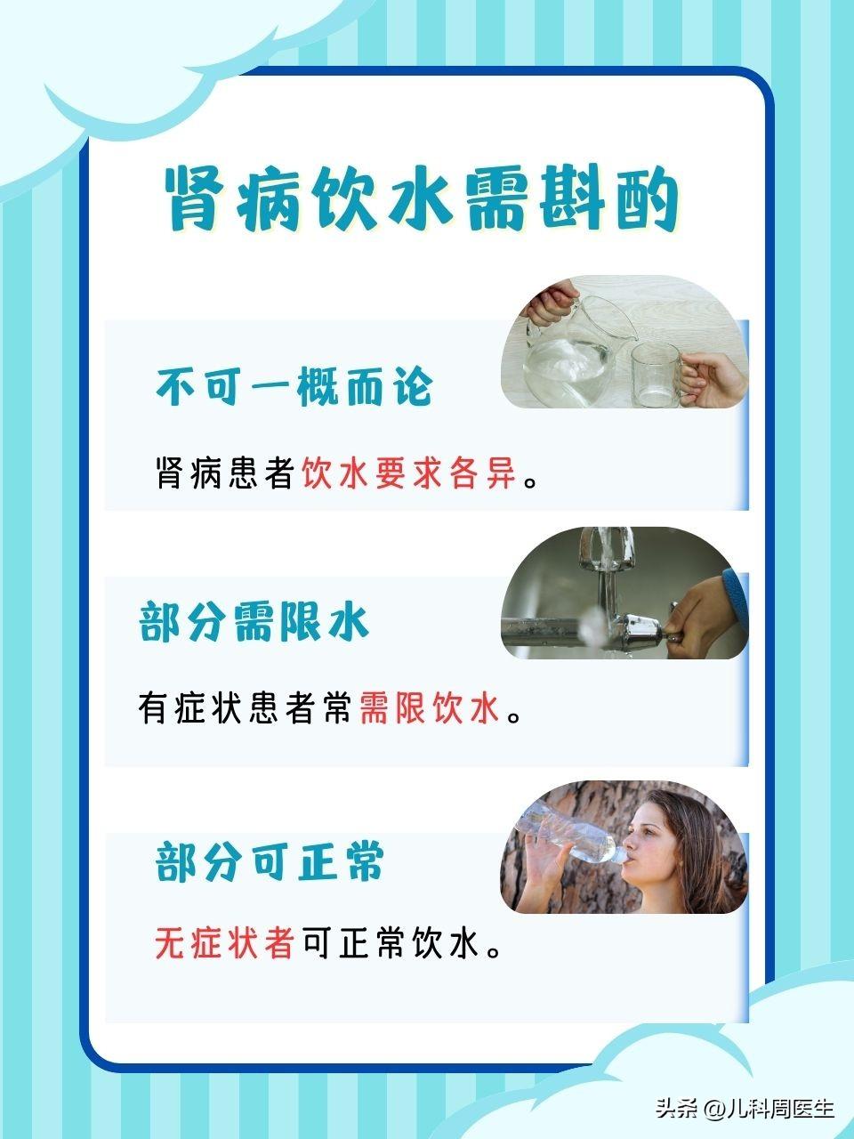 喝水后有这四个异常,当心是你的肾脏在向你发出“求救信号”! 咱们中国有句老话:“宁可食不饱,不可不喝水。”水是生命之源,但有些人喝了水之后,身体会出现反常的情况。这些情况可能是你的肾脏发出的“呼救声”。 肾脏——是我们人体重要的内分泌排泄器官,如果肾脏出现了异常,可能会出现以下四个异常表现: 01 脸部、四肢水肿 因为肾脏主水,当肾脏出现问题时,体内多余的水分无法排出,就会潴留在体内,最典型的表现就是水肿。 02 饮水不多,却频繁起夜 正常人一天排尿3~6次,但如果饮水量不大,却仍然频繁起夜,或总是有尿不净的感觉,可能提示您的肾脏浓缩功能出现了减退。也有可能是膀胱的问题,尤其是男性朋友们,一定要警惕是否是前列腺的疾病。 03 尿液中漂浮着细密的小泡泡 也就是我们常说的“蛋白尿”。由于肾小球滤过膜的损伤,部分蛋白质漏出到尿液中,使得尿液表面张力增强,从而形成不易破裂的细密小泡沫。如果您发现自己有类似的情况,请务必尽早就医检查肾功能。 04 高血压 肾脏疾病会导致水分潴留在血管内,从而引起血压升高,并且难以控制。 以上这四种情况都是肾脏疾病的典型信号。我国成年人慢性肾病患病率高达10.8%,而知晓率却不足5%。所以,越早发现这些异常,治疗的效果越好。 最后啊,我们再给大家推荐三种健康的饮用水: 01 白开水 《中国居民膳食指南》建议,成年男性每天应饮用1500~1700毫升的白开水,感觉口干舌燥时可以增加到2000毫升左右。但是像青光眼、心脏病及各种肾病的朋友,要遵医嘱减少饮水量。而且不要憋尿,憋尿会加重肾脏负担,容易引发结石或者尿路感染。 02 玫瑰花和茉莉花茶 玫瑰和茉莉都属于药食同源的植物,玫瑰能行气解郁、活血散淤,茉莉能疏肝理气、美容养颜。取10克玫瑰和10克茉莉混合后,用水煎煮15分钟左右即可饮用。需要注意的是,孕妇和经期女性要慎喝玫瑰花茶。 03 枸杞和菊花茶 10克枸杞搭配3克菊花冲泡,能够清热解毒、疏风明目。需要注意的是,体质偏寒、脾胃虚寒以及经期女性避免饮用。 以上就是我总结的健康饮水方案,大家收藏转发给需要的人吧。(说明,图片来自网络,如有侵权请联系作者删除)