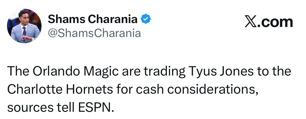 Shams:奥兰多魔术将泰厄斯·琼斯交易至夏洛特黄蜂,换取现金补偿。