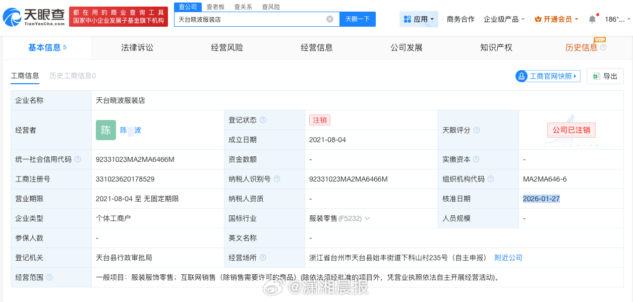 从天眼查App获悉,天台丽波电子商务有限公司成立于2021年8月,法定代表人为杨某,注册资本100万人民币,经营范围包括互联网销售、服装服饰批发、服装辅料销售等。股东信息显示,该公司由杨某、陈某波共同持股。值得注意的是,陈某波经营的天台晓波服装店已于2026年1月27日注销。#网购娃娃菜中毒反转再反转#