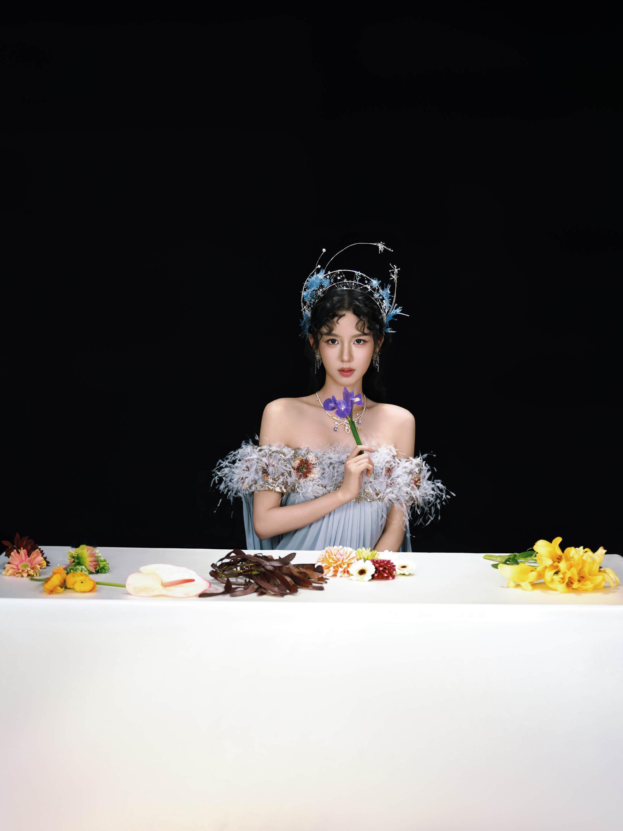 周也身穿RamiKadi2025春夏定制系列淡蓝色抹胸羽饰裙装,搭配TA