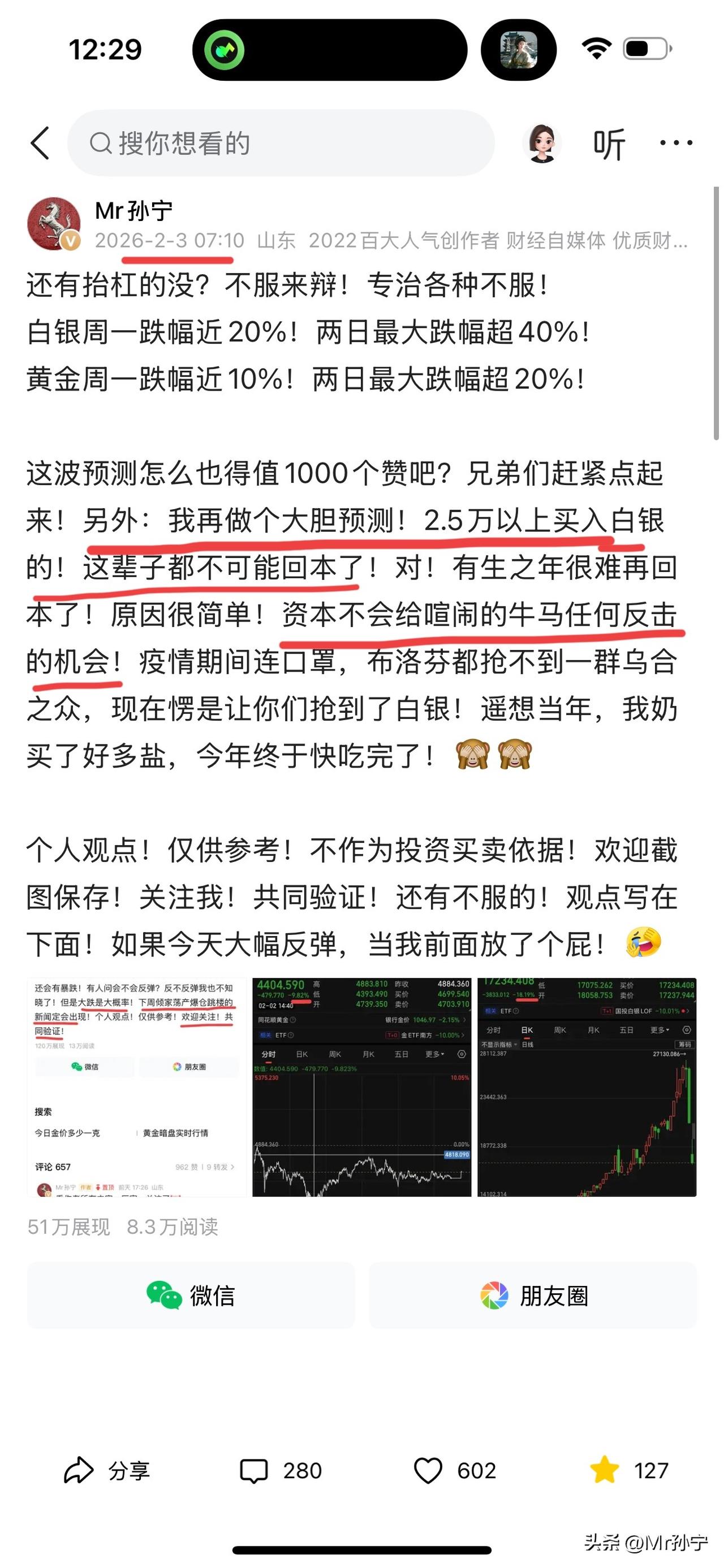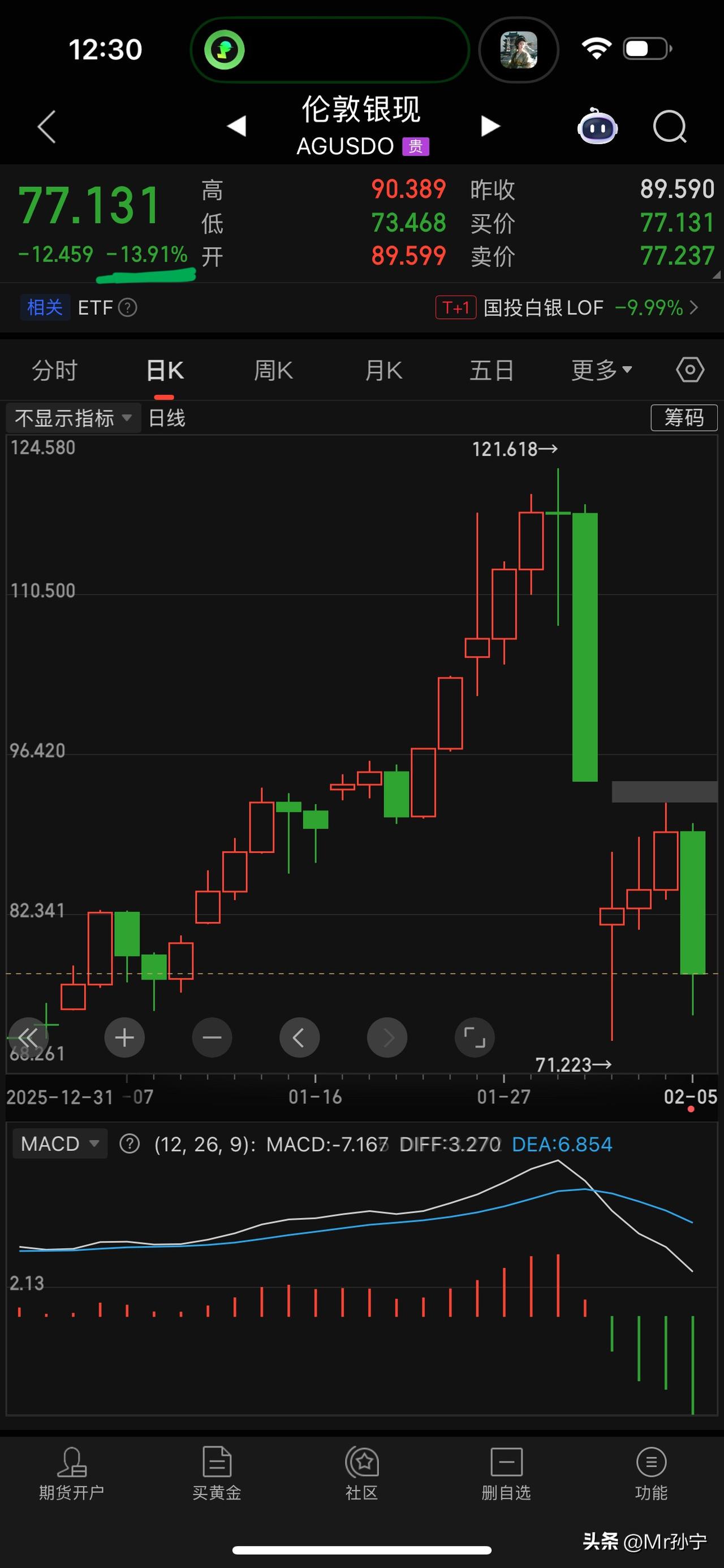 股市今天又大跌2%! 白银今天又大跌近15%! 兄弟们,就问小孙这预判?到底怎么样?小孙今天再强调一次:2.5万以上买入白银的!这辈子可能都别想回本了!另外,目前最好的投资品不是股市、不是黄金、不是白银、不是黄铜、也不是电力变压器!因为他们的风口通通成为过去了!那到底目前买入什么合适?绝大多数人都不知道,绝大多数人也都没发现!等大多数人发现的时候,已经晚了!谁也想不到目前最好的投资品是啥!只有小孙知道! 有没有想知道的老铁?在评论区扣:666!满1000条评论!我就告诉大家!666666~走起来!