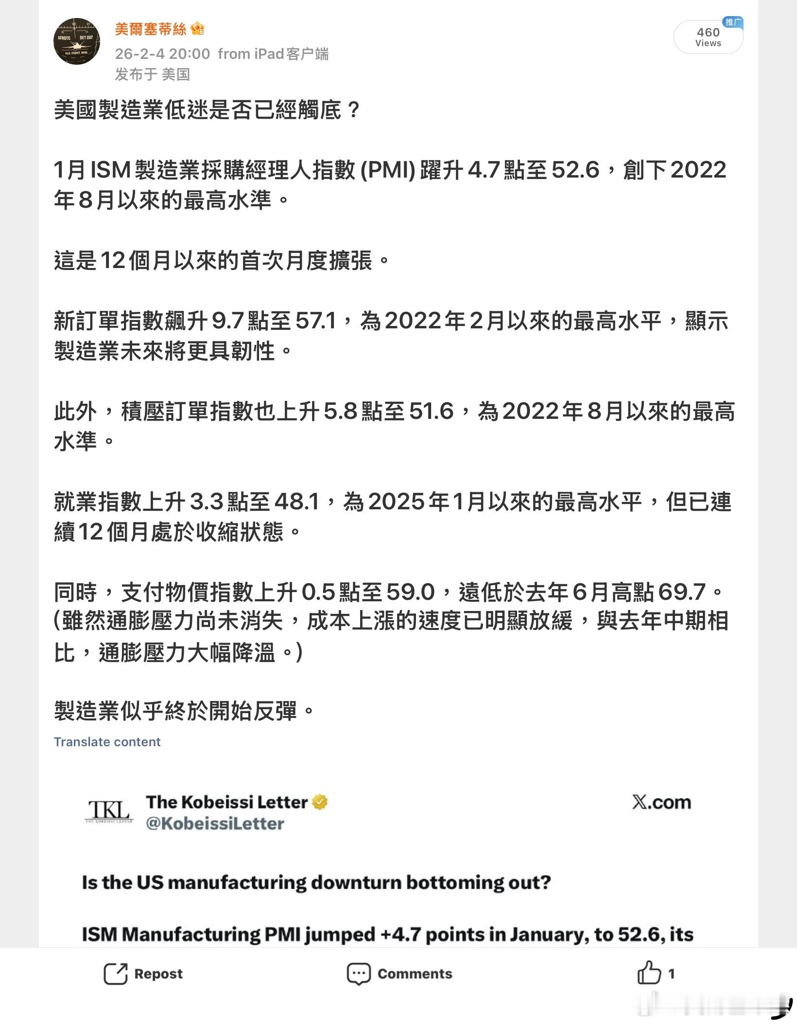 美國製造業低迷是否已經觸底?1月ISM製造業採購經理人指數(PMI)躍升4.7點