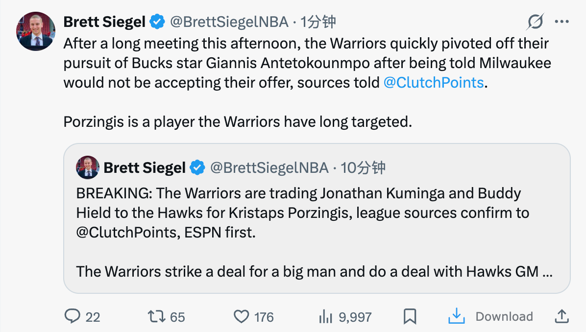 ClutchPoints:经历了今天下午的一个长谈,勇士队在得知密尔沃基不会接受他们的报价后,迅速放弃了对雄鹿球星扬尼斯·阿德托昆博的追求。勇士老鹰交易库明加波神互换东家