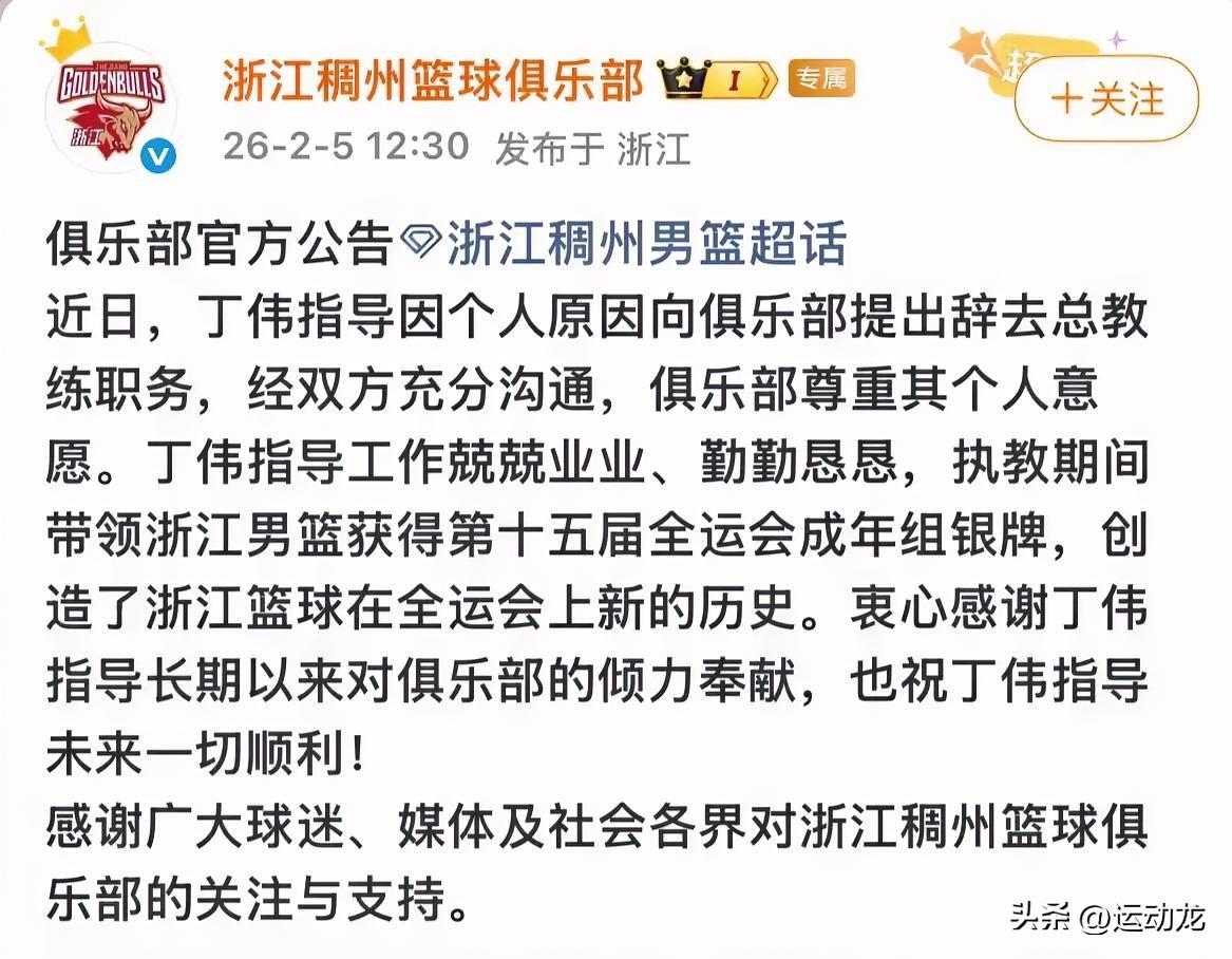 丁团长辞职是想去抖音当评论员吗? 丁伟指导因个人原因向浙江俱乐部提出辞去总教练职务。其执教期间带领浙江男篮获得第十五届全运会成年组银牌,创造了浙江篮球在全运会上新的历史。 感觉丁团长做教练只是临时工,或者说是救火队员,他是心思应该在球赛解说员上。丁团长做教练的水平众说纷纭,高低难辨,但是频繁更换工作是不争的事实。 球赛评论员的水平绝对是杠杠的,没得说!抖音目前最缺的是有水平评论员,如果抖音能请丁团长去做官方直播评论员,倒是篮球球迷们的福音。