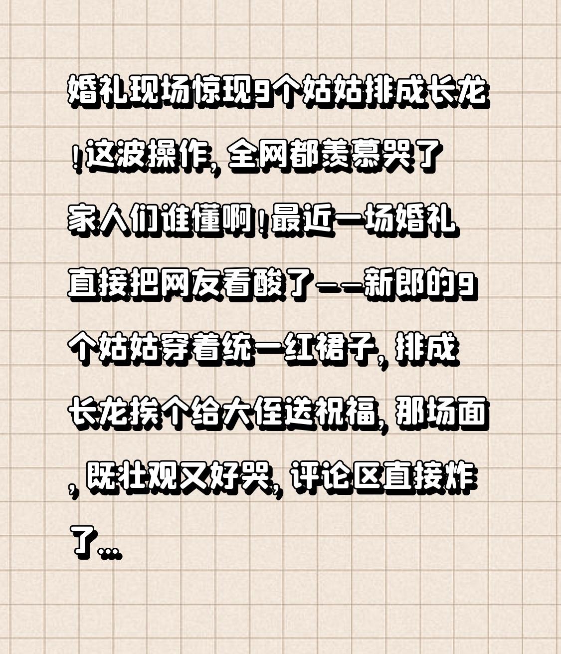 婚礼现场惊现9个姑姑排成长龙!这波操作,全网都羡慕哭了 家人们谁懂啊!最近一场婚礼直接把网友看酸了——新郎的9个姑姑穿着统一红裙子,排成长龙挨个给大侄送祝福,那场面,既壮观又好哭,评论区直接炸了锅! 本来这场婚礼跟普通喜宴没啥两样,新人交换戒指、敬茶改口,流程顺顺利利。直到司仪喊“有请新郎的姑姑们上台送祝福”,台下突然站起来9位打扮得漂漂亮亮的阿姨,一字排开往台上走,红色裙摆连成一片,瞬间把现场气氛拉满!宾客们都看呆了,手机齐刷刷举起来拍照,还有人忍不住喊:“这阵容也太牛了吧!” 谁知道更戳人的还在后面!带头的大姑手里捧着个红布包,走到侄子面前红了眼眶:“大侄啊,从小看着你长大,如今成家了,姑姑们没啥能给你的,就盼着你往后和媳妇好好过日子。”说着就把红包塞到新人手里,后面的姑姑们挨个上前,有的给新人整理衣领,有的叮嘱“过日子要互相包容”,还有的悄悄抹了眼泪,最后9个人一起张开双臂,给了新人一个大大的集体拥抱。 原来新郎从小跟着爷爷奶奶长大,父母忙着打工,9个姑姑就轮流照看他,送他上学、给她做爱吃的菜、生病时轮流陪护。用姑姑的话说:“我们没有儿子,这大侄就是我们共同的宝贝,看着他成家,比自己孩子结婚还高兴!”为了这场婚礼,姑姑们提前一个月就约好买同款红裙子,还偷偷排练了送祝福的顺序,就想给大侄一个难忘的惊喜。 现场有宾客感慨:“现在好多亲戚走着走着就散了,这样的姑侄情也太少见了!”新人更是感动得说不出话,新娘握着姑姑们的手说:“谢谢姑姑们,以后我也是你们的女儿,咱们一大家子永远热热闹闹!” 其实最让人羡慕的不是排场,而是这份打断骨头连着筋的亲情。不是所有家庭都能有这样的凝聚力,也不是所有姑姑都能把侄子当成亲儿子疼。愿我们都能在鸡零狗碎的生活里,守住这份珍贵的亲情,愿每个孩子都能被家人的爱包围,愿每个婚礼都能有这样温暖的瞬间。 看完这个视频,你是不是也想起了自己的姑姑?评论区聊聊你和姑姑的暖心故事,点赞转发,把这份美好传递下去!