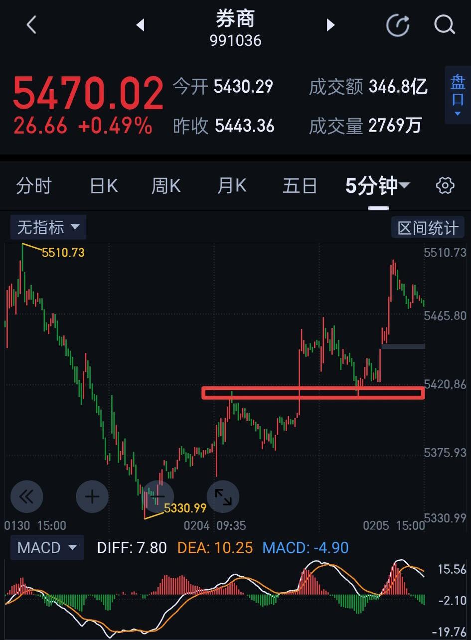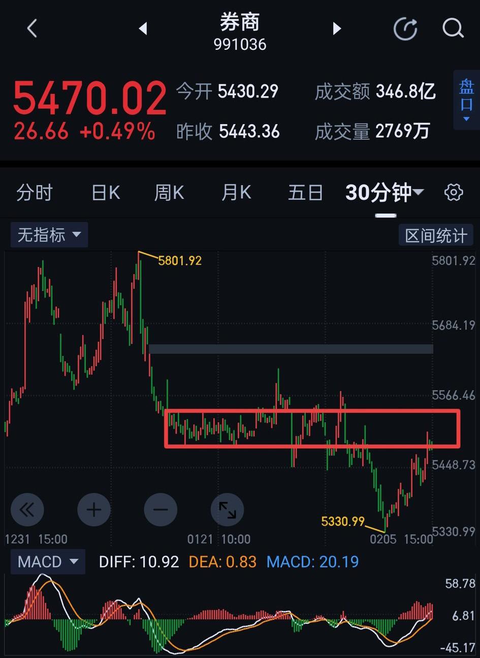 券商板块逆势上涨。继昨天日K线底分型后继续向上延伸,一改往日"一日游"特征,按现在走势形成日线一笔上的可能性很大。目前从5330开始的三十分钟一笔上已经回到了前期的五分钟中枢内,图〈1〉,围绕该中枢的三卖隐患已排除。前天提示的盘整背驰一买点5330和昨天的二买点5375被进一步确认。五分钟图上,从5330低点起呈现是一个一分钟的奔走中枢,图〈2〉,从结构看多方向上的意愿还是比较强。明天只要能在5410上方站稳,当下的三十分钟一笔上会继续向上生长。这样券商形成阶段性反转的概率将大大加强。券商在此位置机会大于风险,不宜过分悲观。