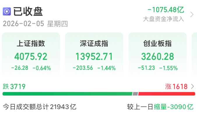 #贵州茅台连续4日上涨#【超3700只个股下跌,贵金属、光伏设备领跌,贵州茅台连续4日上涨】#贵金属光伏设备领跌# 2月5日,A股三大指数集体下跌。截至收盘,沪指跌0.64%,深成指跌1.44%,创业板指跌1.55%,北证50指数跌2.03%,沪深京三市成交额21943亿元,较上日缩量3090亿元,三市超3700只个股下跌。盘面上影视院线、旅游酒店等板块领涨,贵金属、光伏设备分别下跌6.57%、5.31%。午后银行、券商股拉升,其中厦门银行、华林证券涨停。