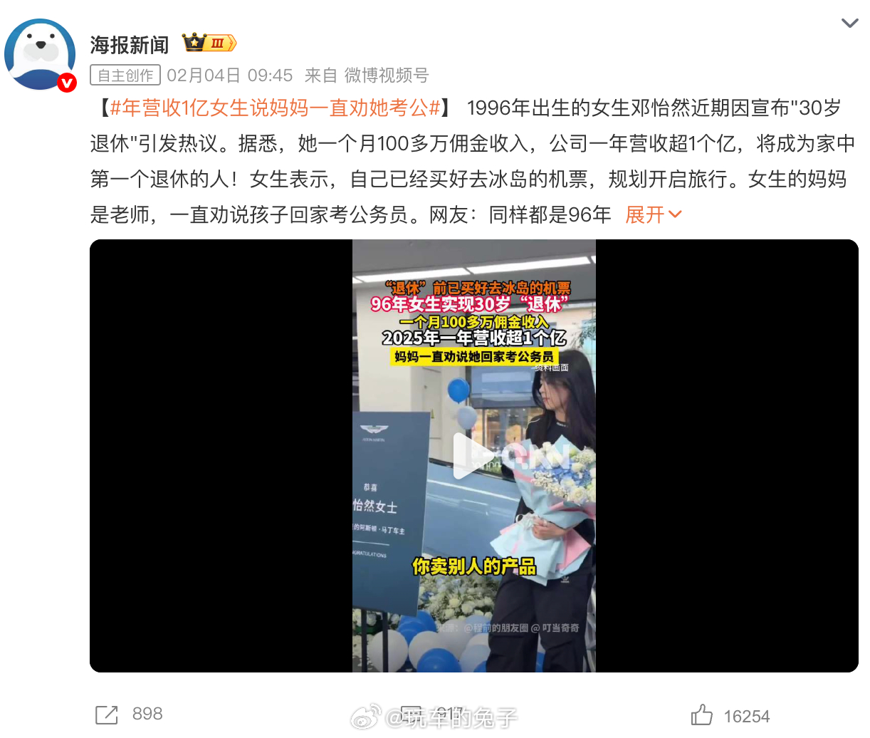 年营收1亿女生说妈妈一直劝她考公 这事儿最近挺火,不少人也在问我,但我是持保留态度的。如果他真的年营收一个亿,而且还是做轻资产CPS电商联盟,那这类体量的商业成绩,正常应该先出现在财经媒体、创投圈或行业报告里,而不是先从微博账号起爆,再被门户网站集中转载。更关键的是,公开信息里看不到平台规模、GMV、商家数量、抽佣比例等核心数据,只有一句漂亮的结果描述。我不是说不可能做到,而是商业不是靠口号跑出来的,也不是靠热搜验证成功的,更没办法用流量叙事替代商业逻辑。另外我很好奇,为什么这人挣了那么多钱,实际社保缴纳人数还是0呢?