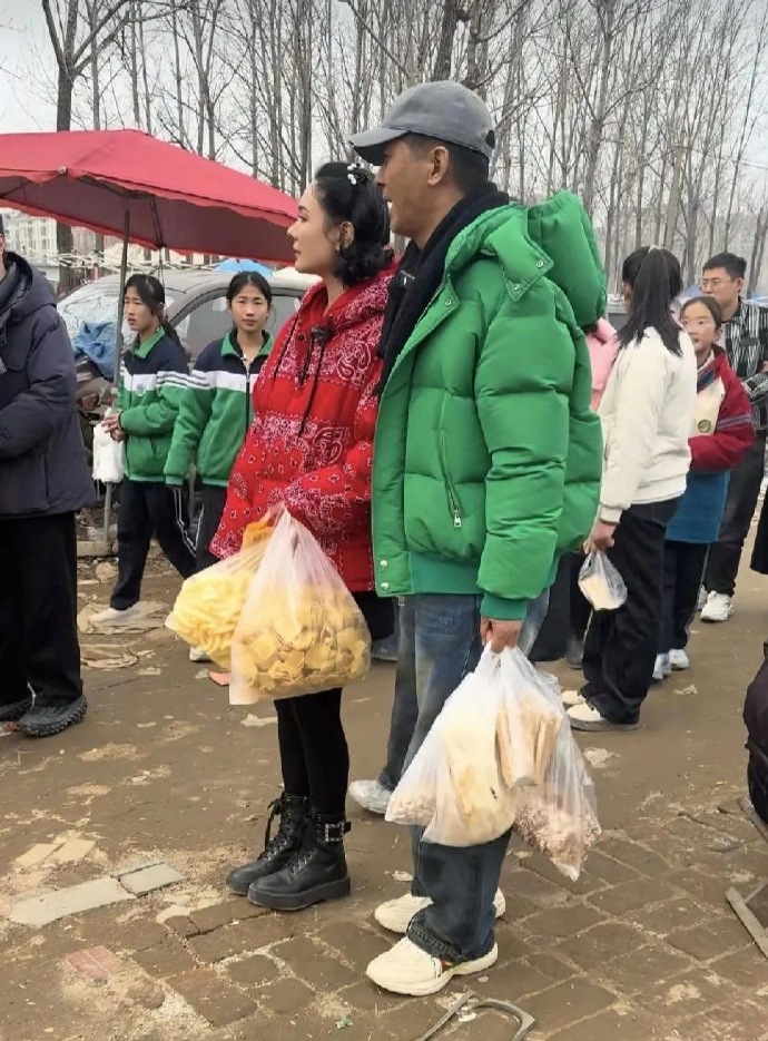 郭晓东和老婆程莉莎回山东农村老家,夫妻俩打扮像农民,去赶大集买年货,周围的路人都不认识他们,看起来好尴尬啊!