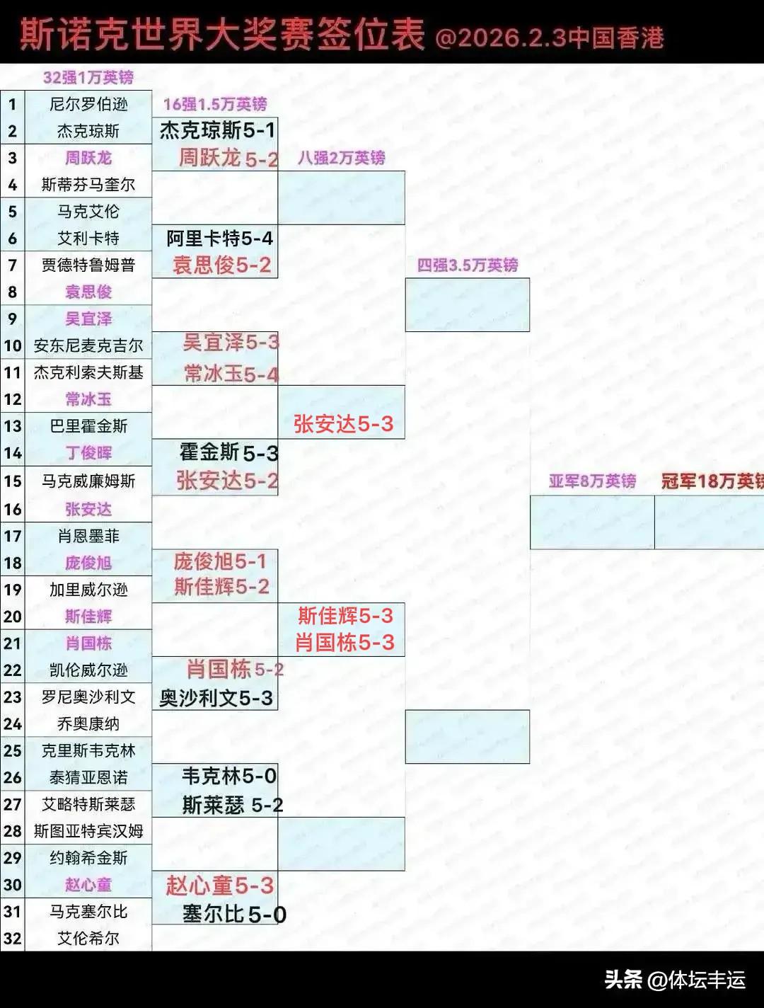 刚刚结束的 1/8 决赛第三场中国德比战,斯佳辉 5 - 3 战胜庞俊旭晋级八强。 其实这次比赛中国选手表现超猛。2 月 5 日,第一轮第二个比赛日结束后,赵心童、斯佳辉等 4 名中国选手晋级,加上首日的肖国栋、吴宜泽等,共有 9 名中国选手晋级 16 强,还淘汰了 5 位世锦赛冠军。像肖国栋,打出一杆破百、3 杆 50 +,以 5 - 3 战胜奥沙利文;张安达也打出来 4 杆破 50 +,5 - 3 战胜霍金斯。期待斯佳辉在后续比赛继续加油!